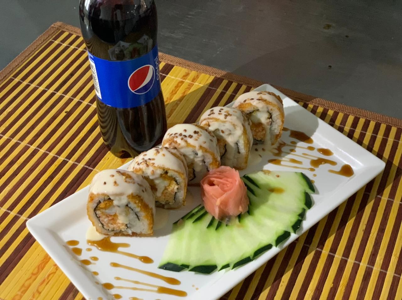 10 bocados apanados rellenos de pescado blanco apanado, aguacate pasta dinamita y salsa de la casa+ Pepsi Cola 250ml*1