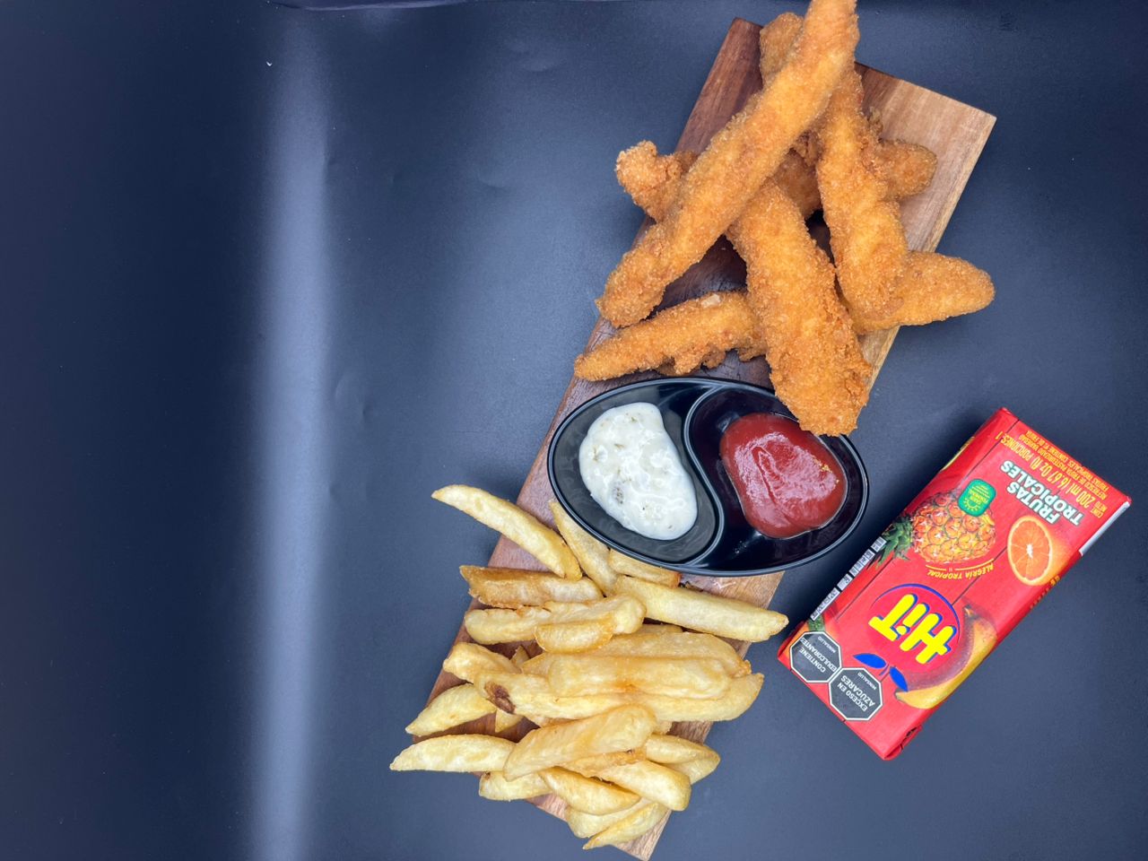 tiras de pollo papas francesas + jugo hit y salsa de la casa