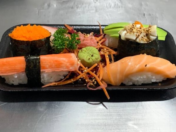 6 Unidades de niguiris, 6 tekamakis de salmón y 4 california roll.