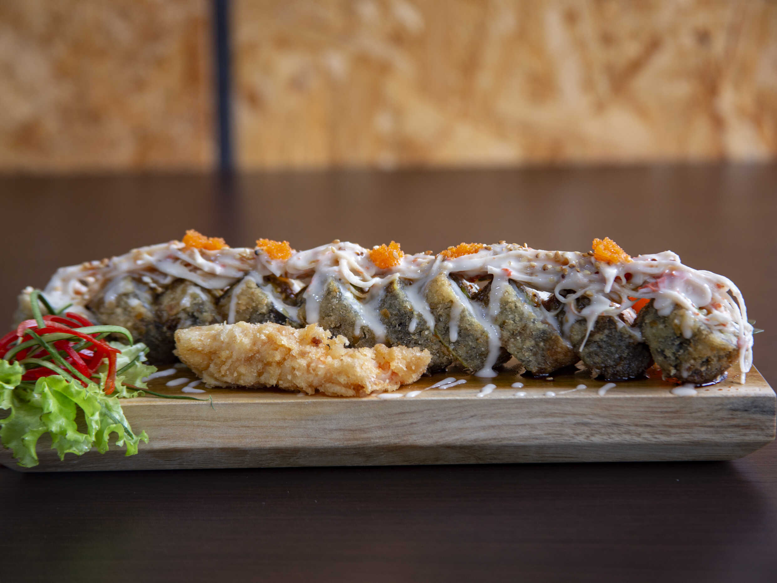 Cangrejo, kampachi ahumado, queso crema, cebollín, masago, salmón empanizado por fuera, tope de salsa de cangrejo, mayonesa, masago y salsa de anguila. Roll tempurizado y empanizado.