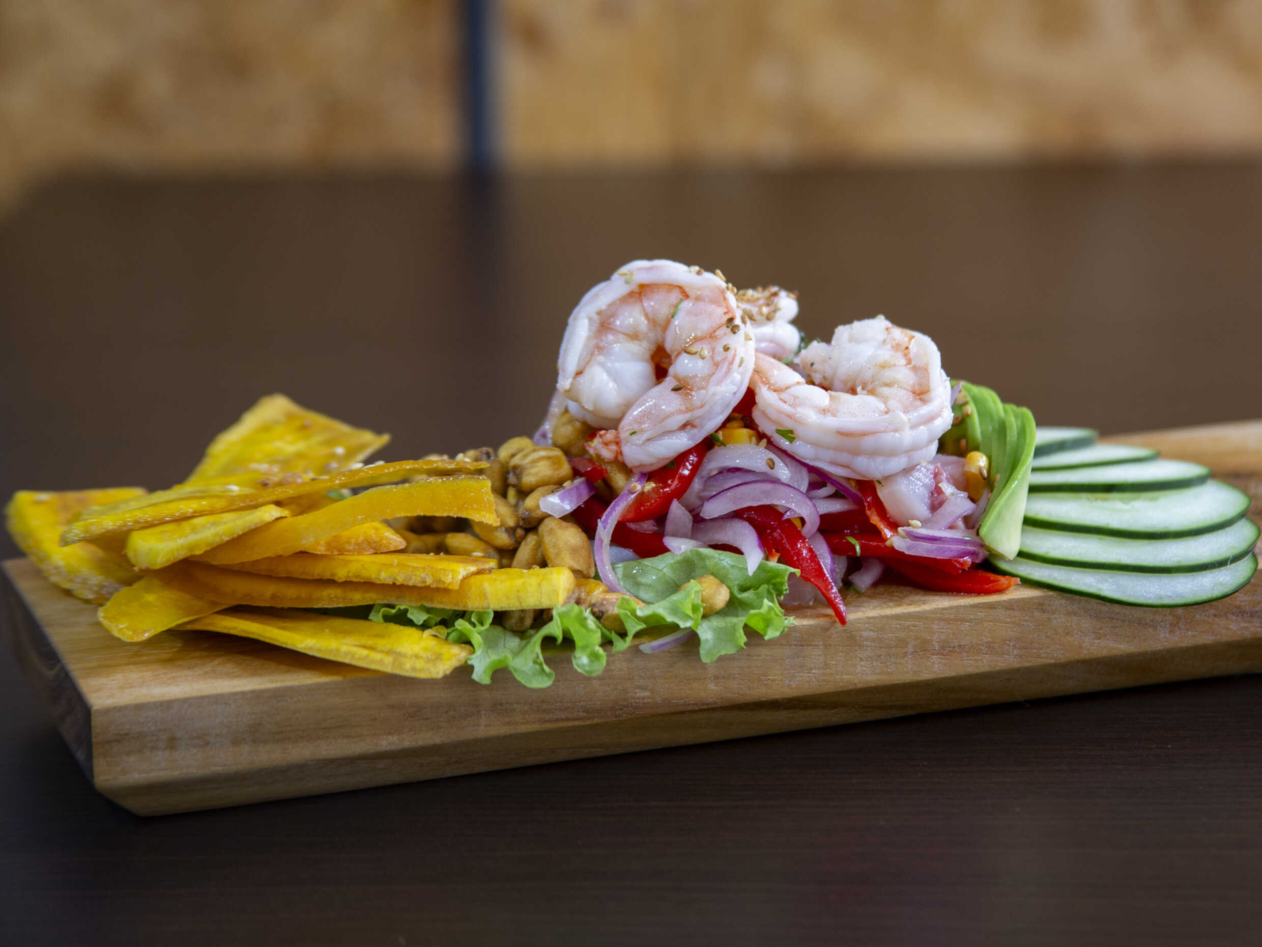 Camarón, cebolla morada, cilantro, ají, aguacate, maíz, leche de tigre, picante y chips.