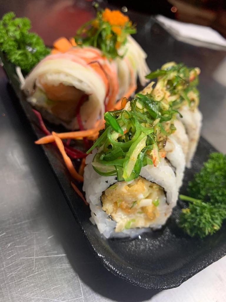 Salmón, kampachi, queso crema, aguacate con tope de cangrejo desmenuzado, wakame y masago.