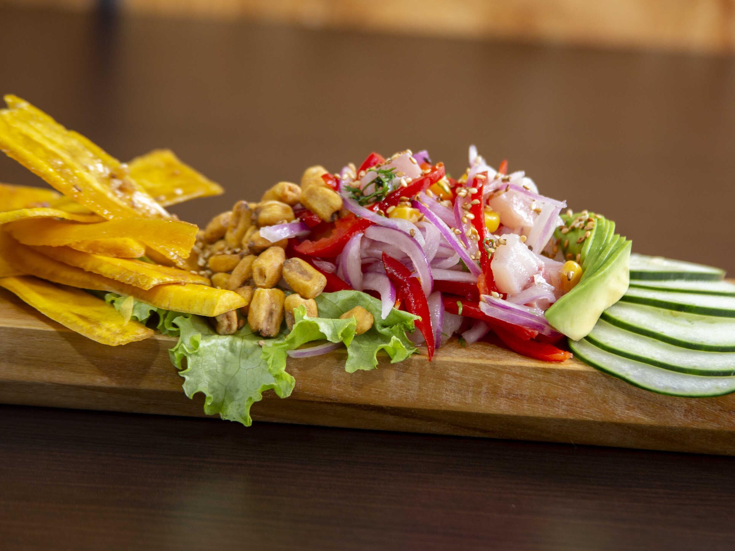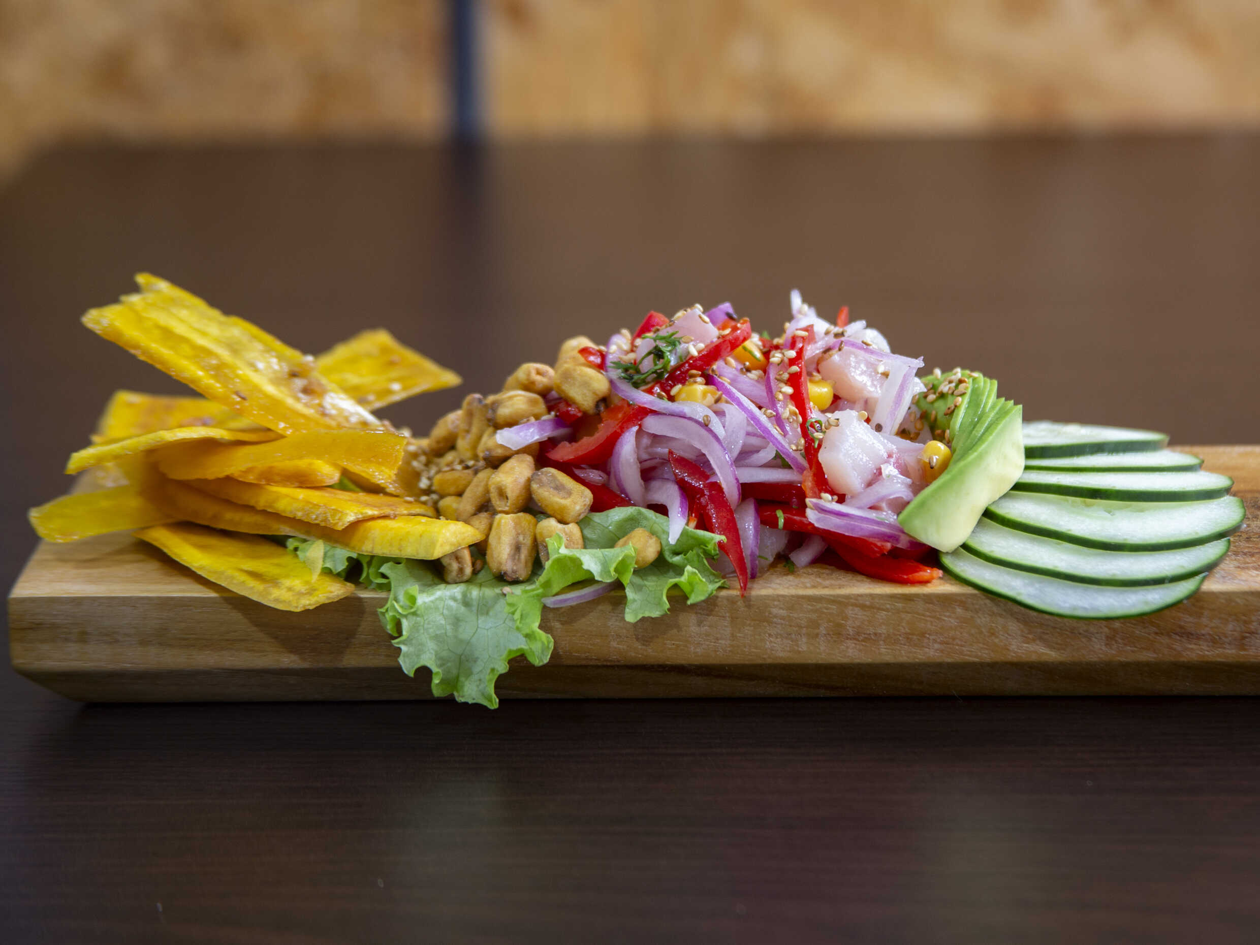 Dados de salmón, camarón, cebolla morada, cilantro, ají, aguacate, champiñón, leche de tigre, picante rocoto y chips.