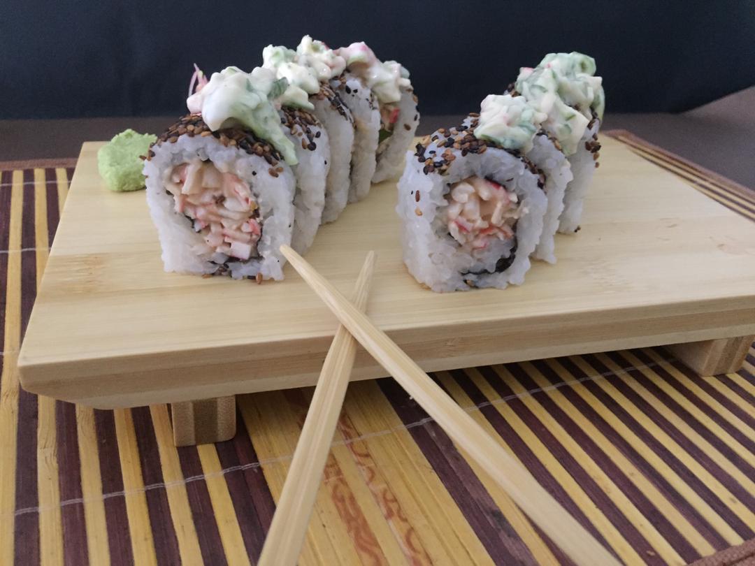 Cangrejo, aguacate, pepino, masago y semillas de sésamo.