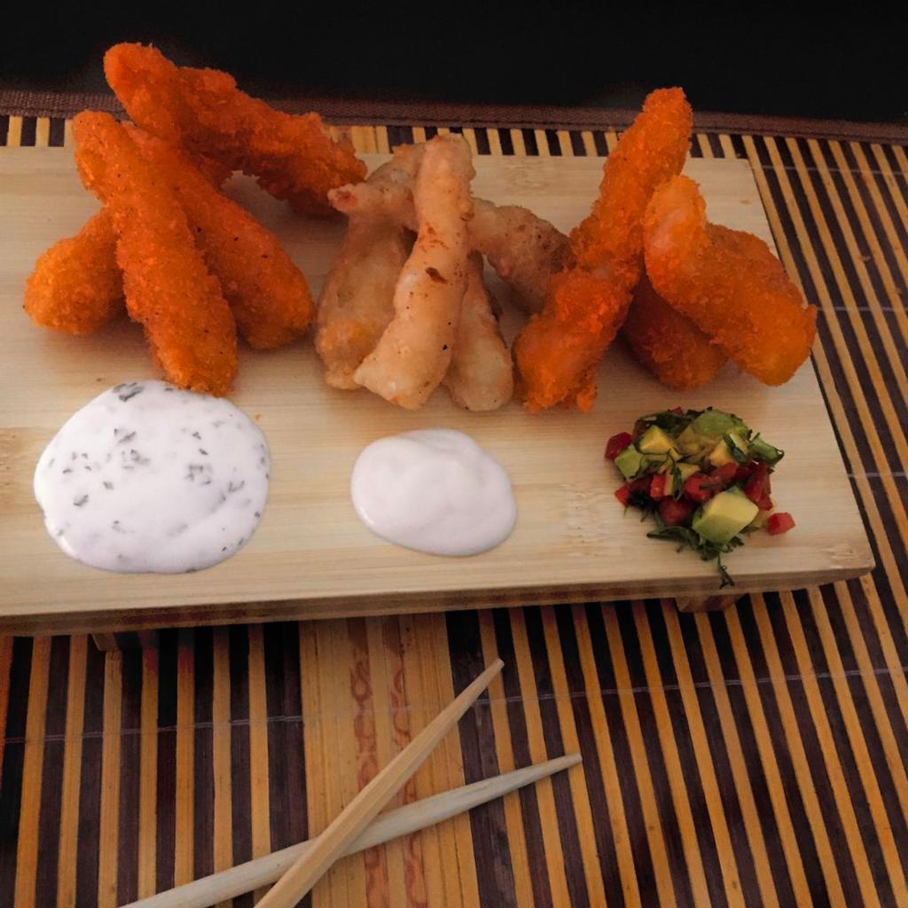 6 Langostinos tempurizados y apanados con salsa tártara y salsa fuji.