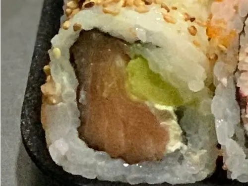 10 bocados rellenos de salmón fresco, queso crema, aguacate y toping de semillas de sesamo.