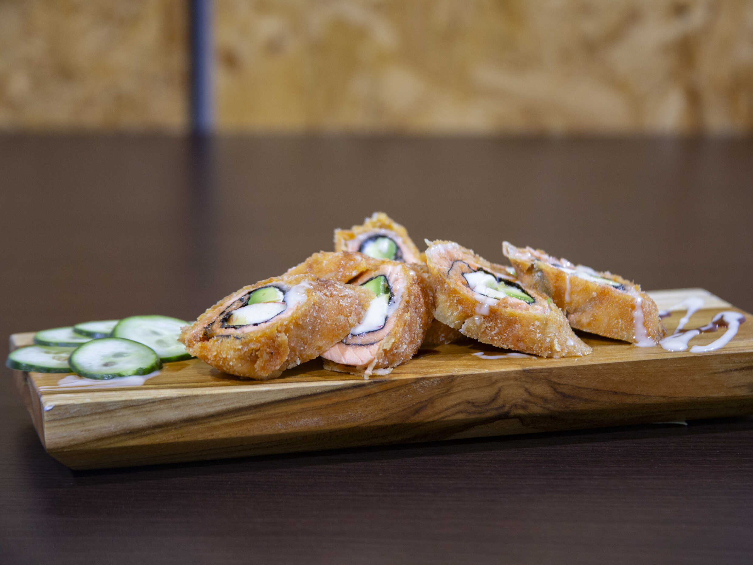 Roll de salmón, queso crema, aguacate, tempurizado en panko en salsas de vino y curry, sin arroz.