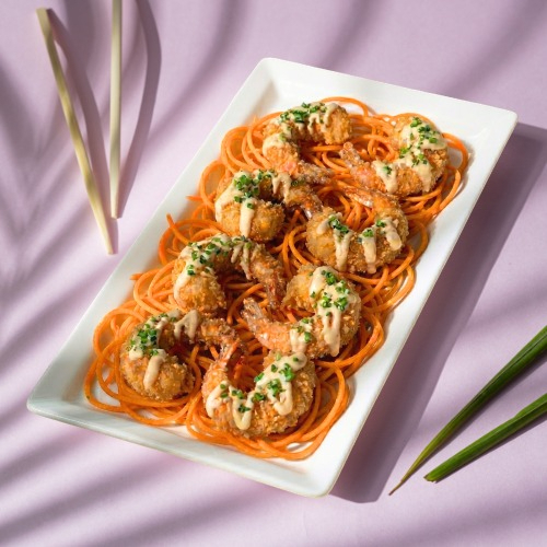 8 camarones crunch, salsa fantasy, cebollín y una cama de zanahoria en espiral.