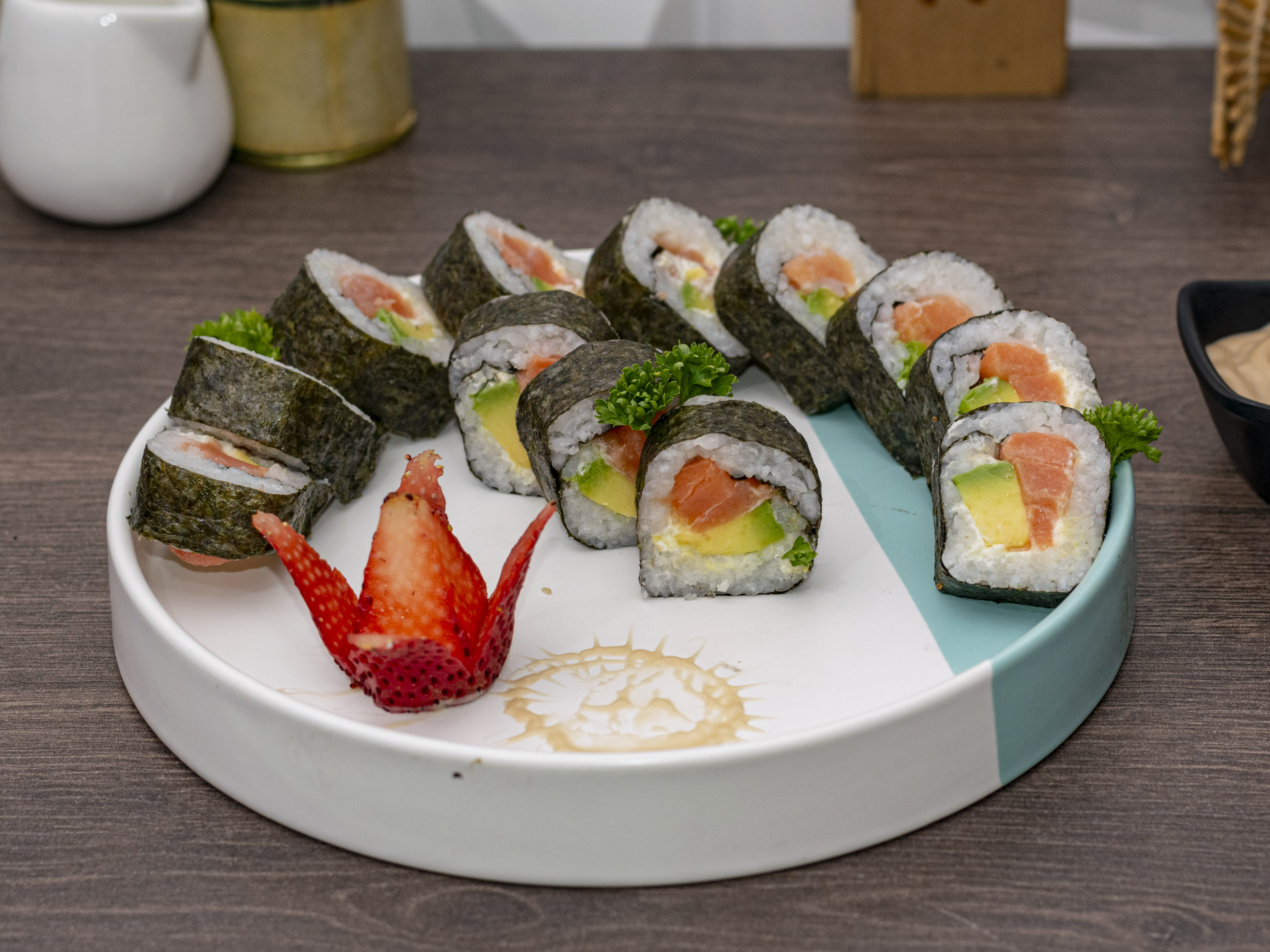 12 Makis entre 3 philadelphia, 3 california apanado, 3 salmón skin y 3 trópical, acompañado de 1 limonadaa.