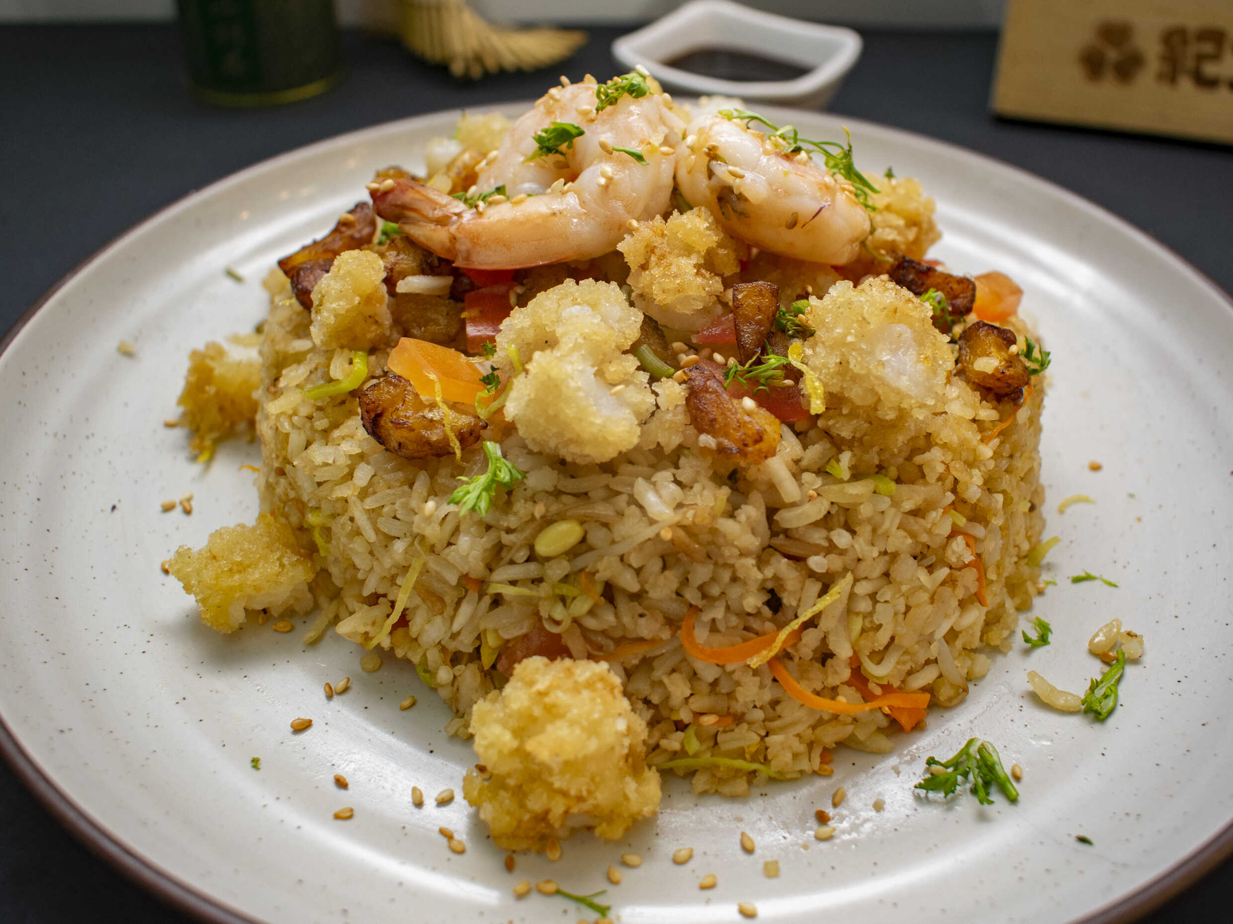 Jitensha Especial*1: Arroz salteado con camaronoes, plátano maduro en cubos, cilantro, pescado blanco apanado, tomate en cubos, vegetales, aderezo con salsa de ostras y nampla. + California 6 pz*1