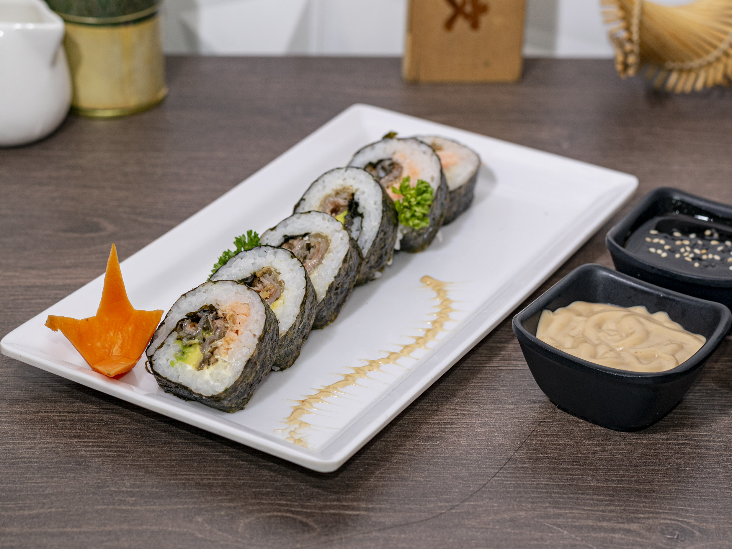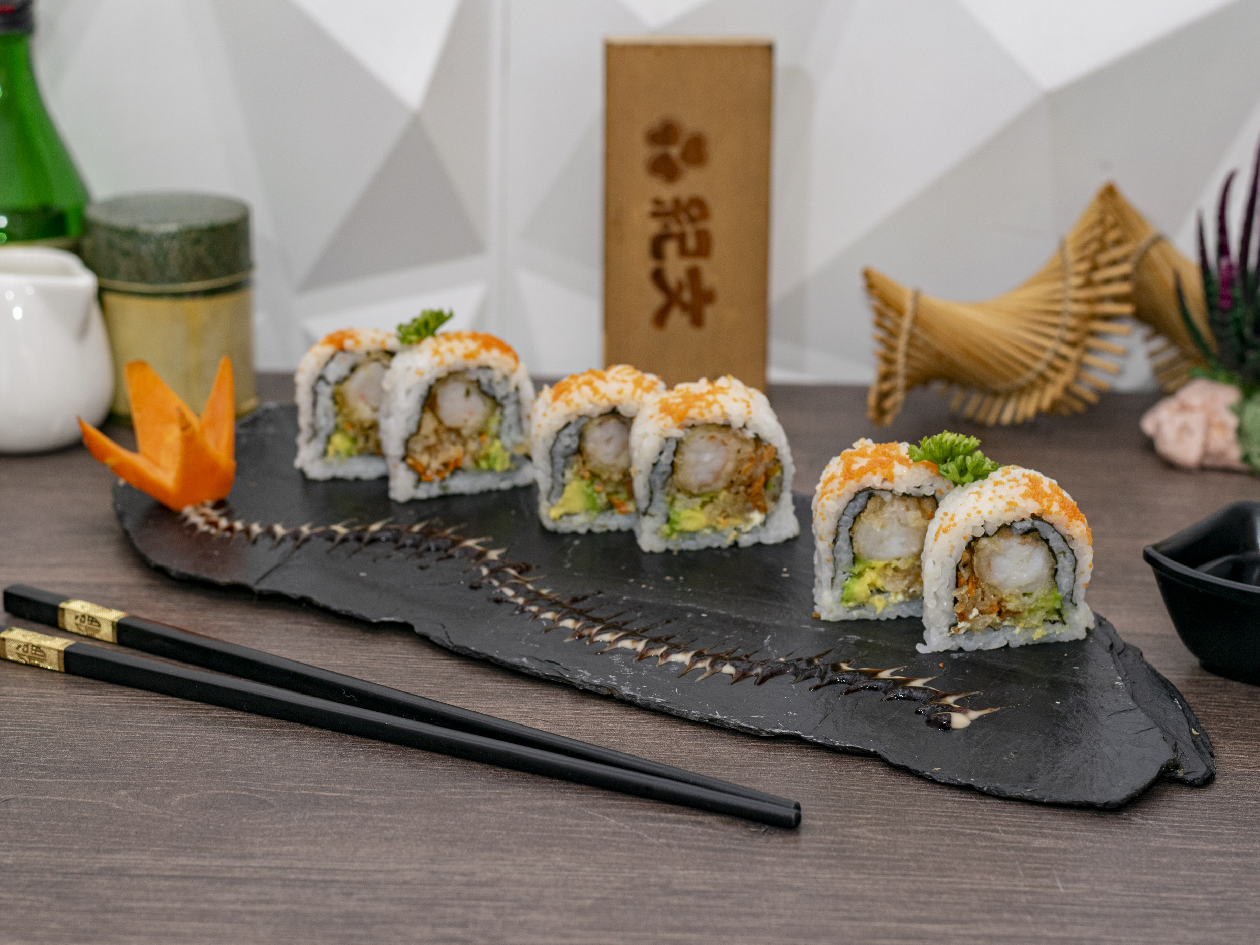 Rollo relleno de langostino crocante, vegetales tempura, queso crema y aguacate.