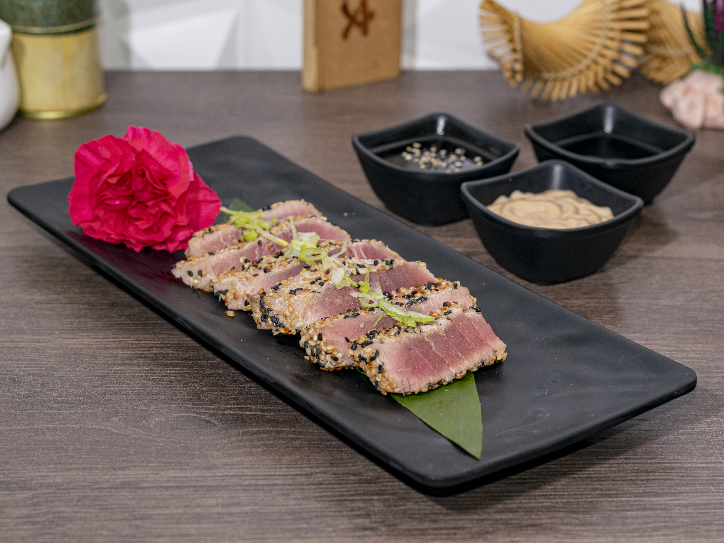 Rollo relleno de palmito de cangrejo, queso crema y mango, cubierto de aguacate, tartar de salmón spicy e hilos de papa dulce.
