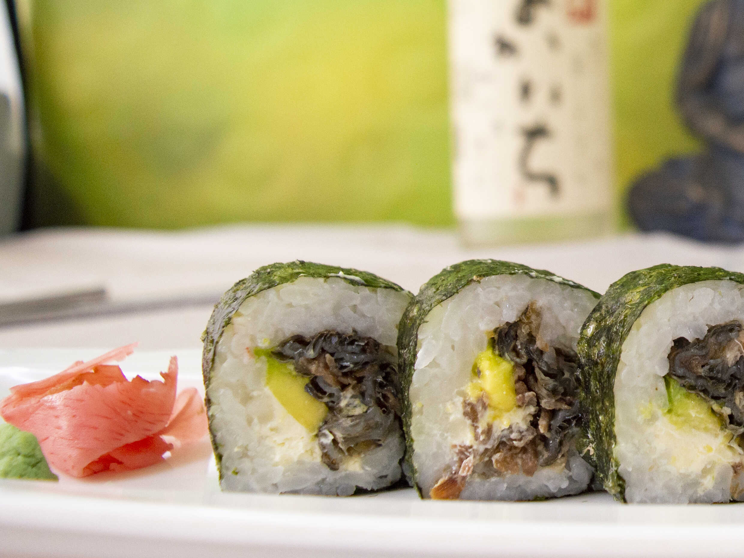 Rollo norimakirelleno de piel de salmón crocante, queso crema y aguacate.