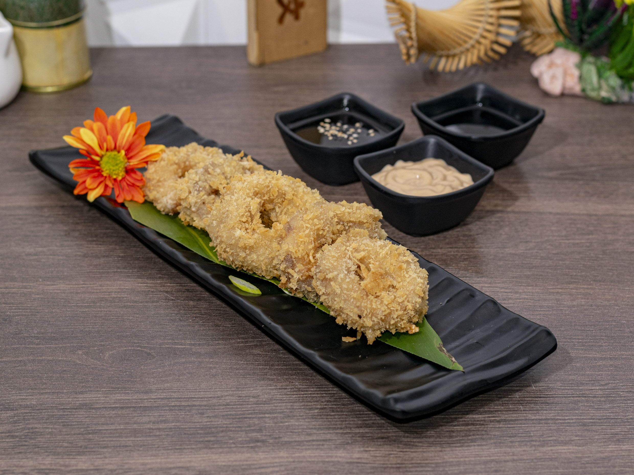 Rollo apanado elleno de pescado blanco, queso crema, palmito de cangrejo y aguacate, acompañado de ensalada de algas y cangrejo.