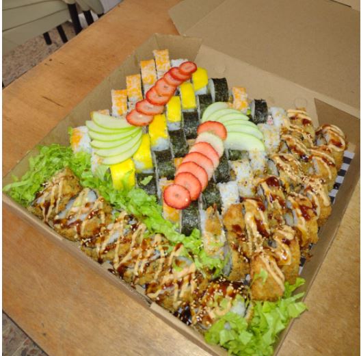 60 Piezas de makis clásicos asi: 6 salmon sking, 6 dinamita, 6 california, 6 filadelfia, 6 ojo d tigre, 6 eby roll, 6 eby tempura, 6 tropical, 6 tiguer, 6 california panko