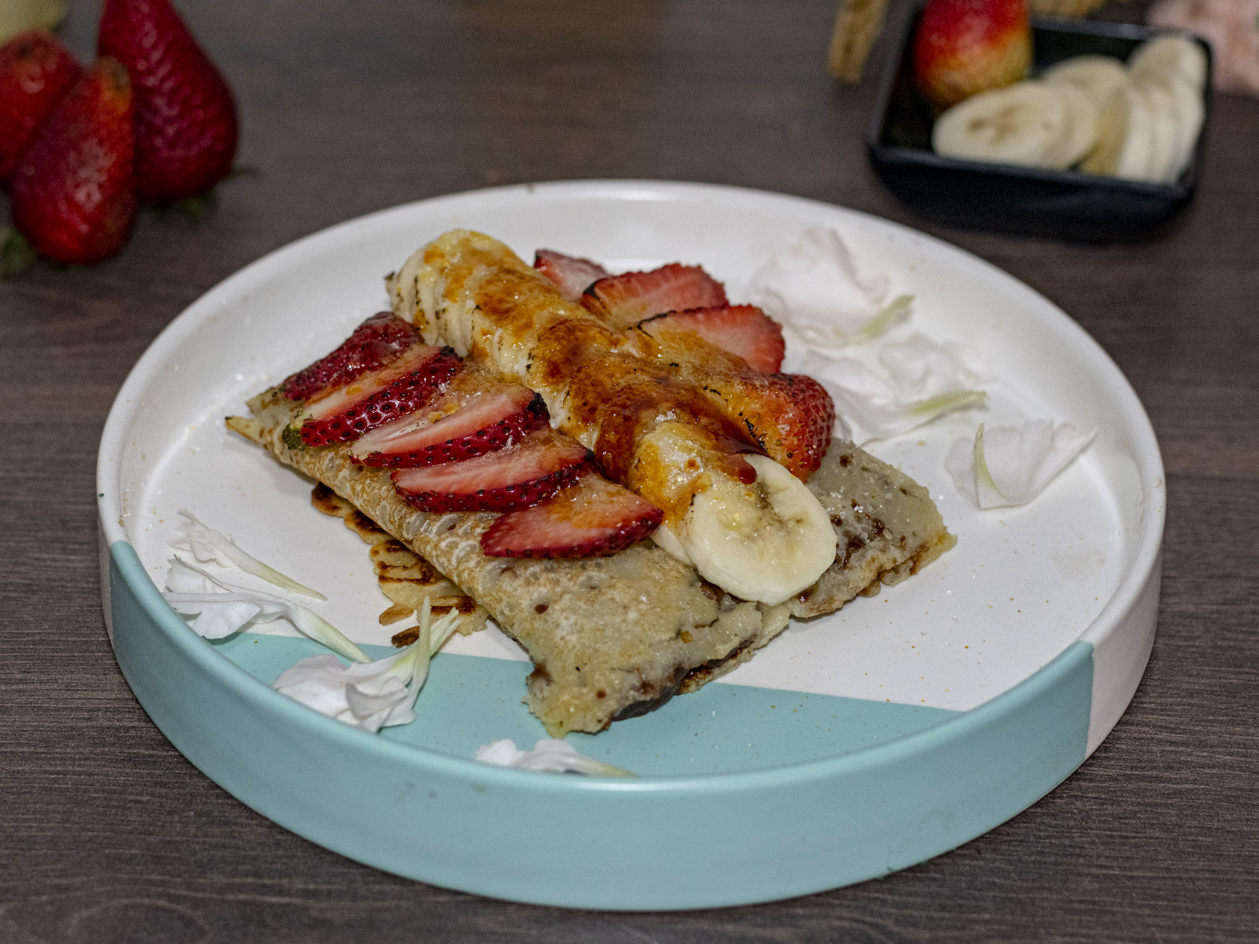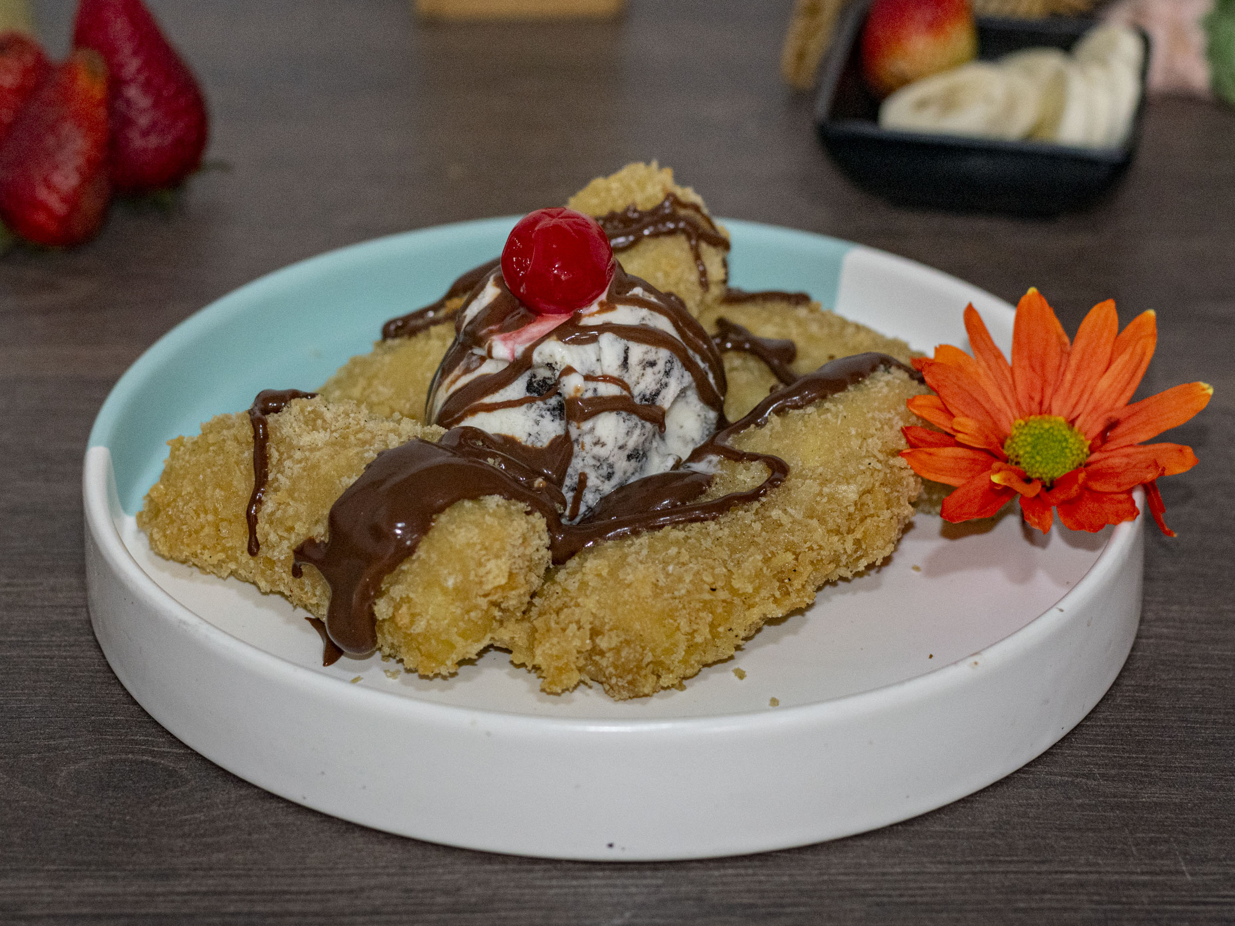 Rollo de plátano maduro, relleno de salmón, queso crema y masago apanado.