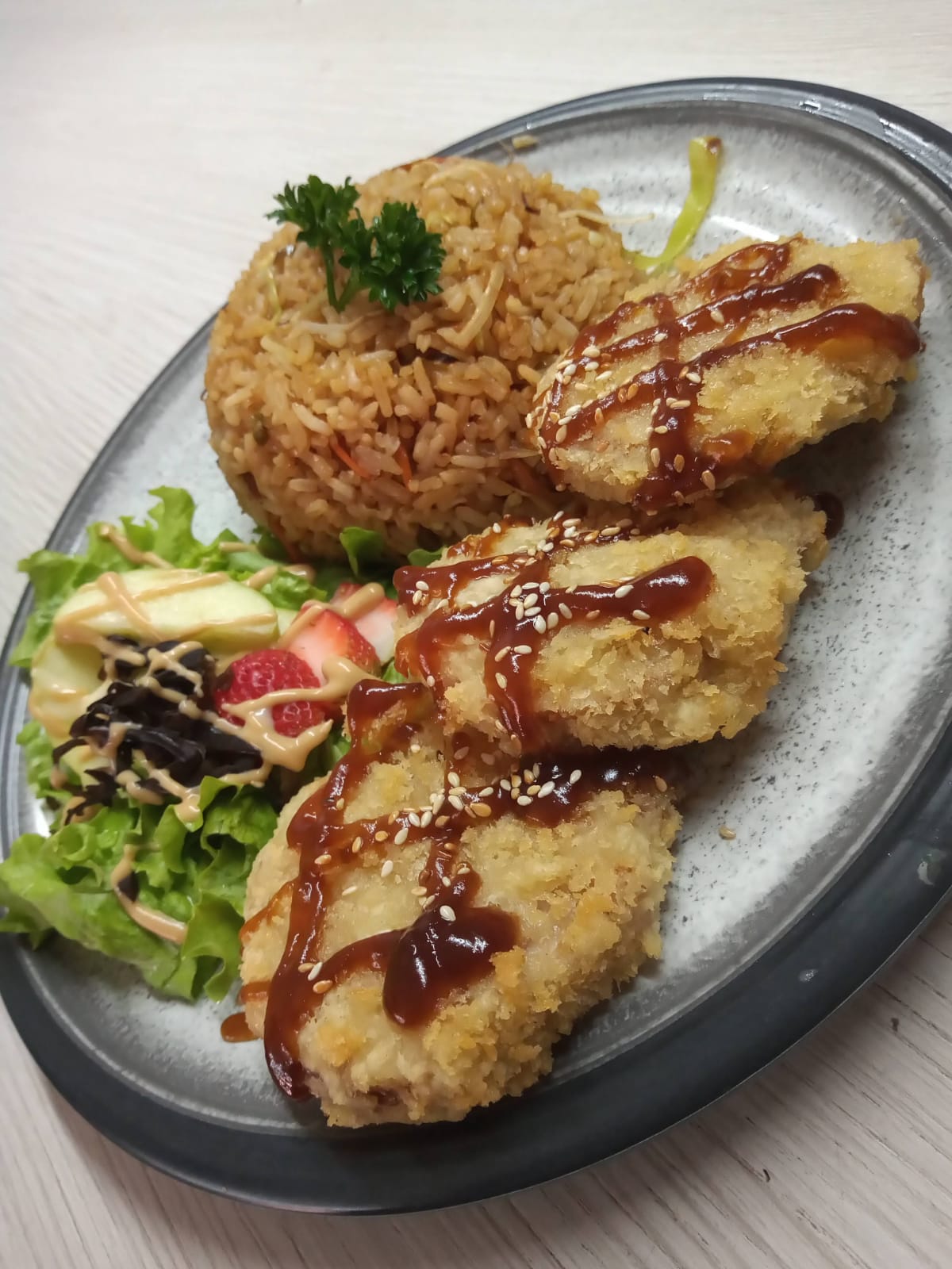 Cerdo marinado y apanado, acompañado de arroz salteado, ensalada del día y sopa miso.