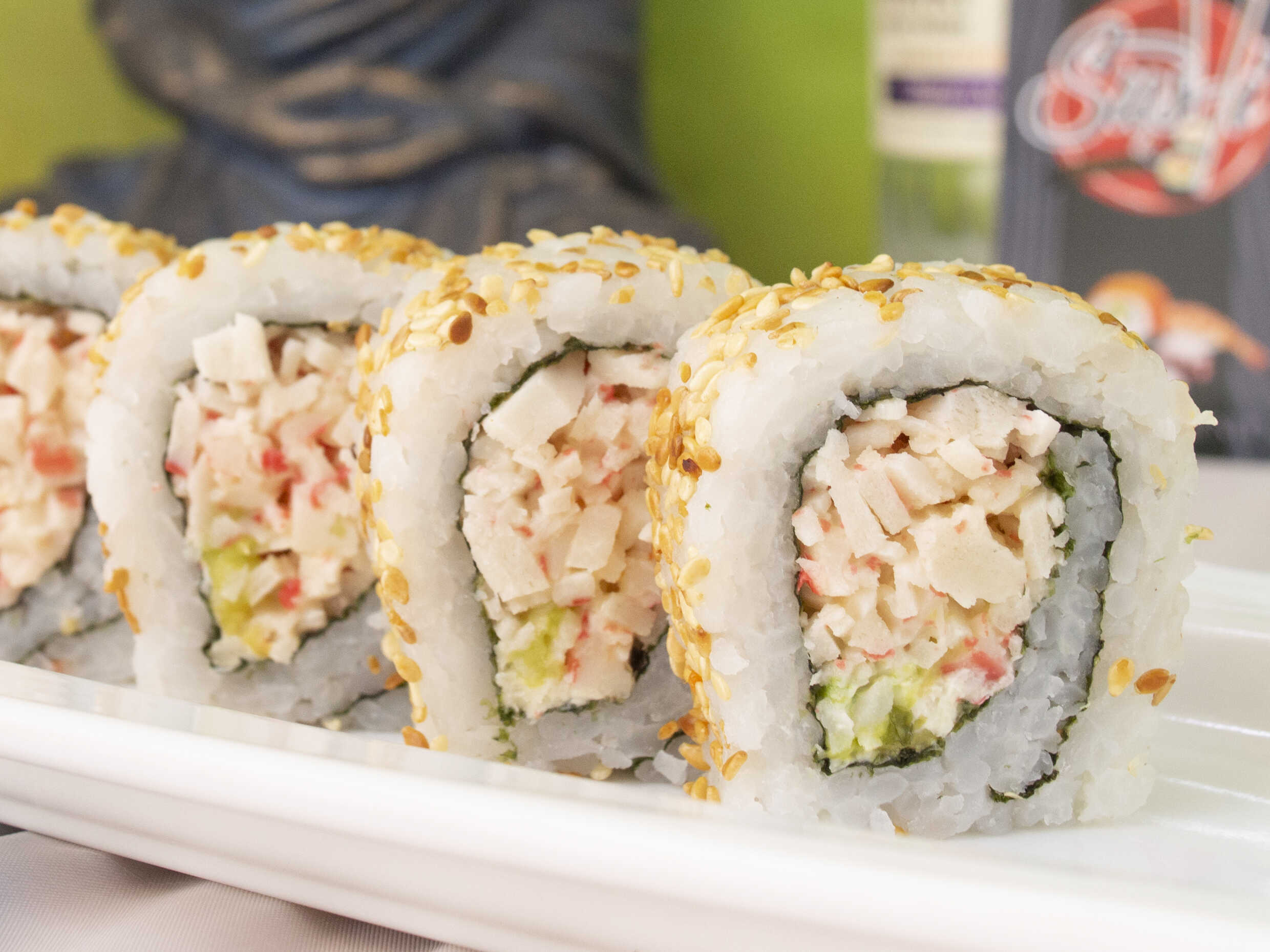 Rollo relleno de mezcla de cangrejo y masago, cuebierto de cangrejo.