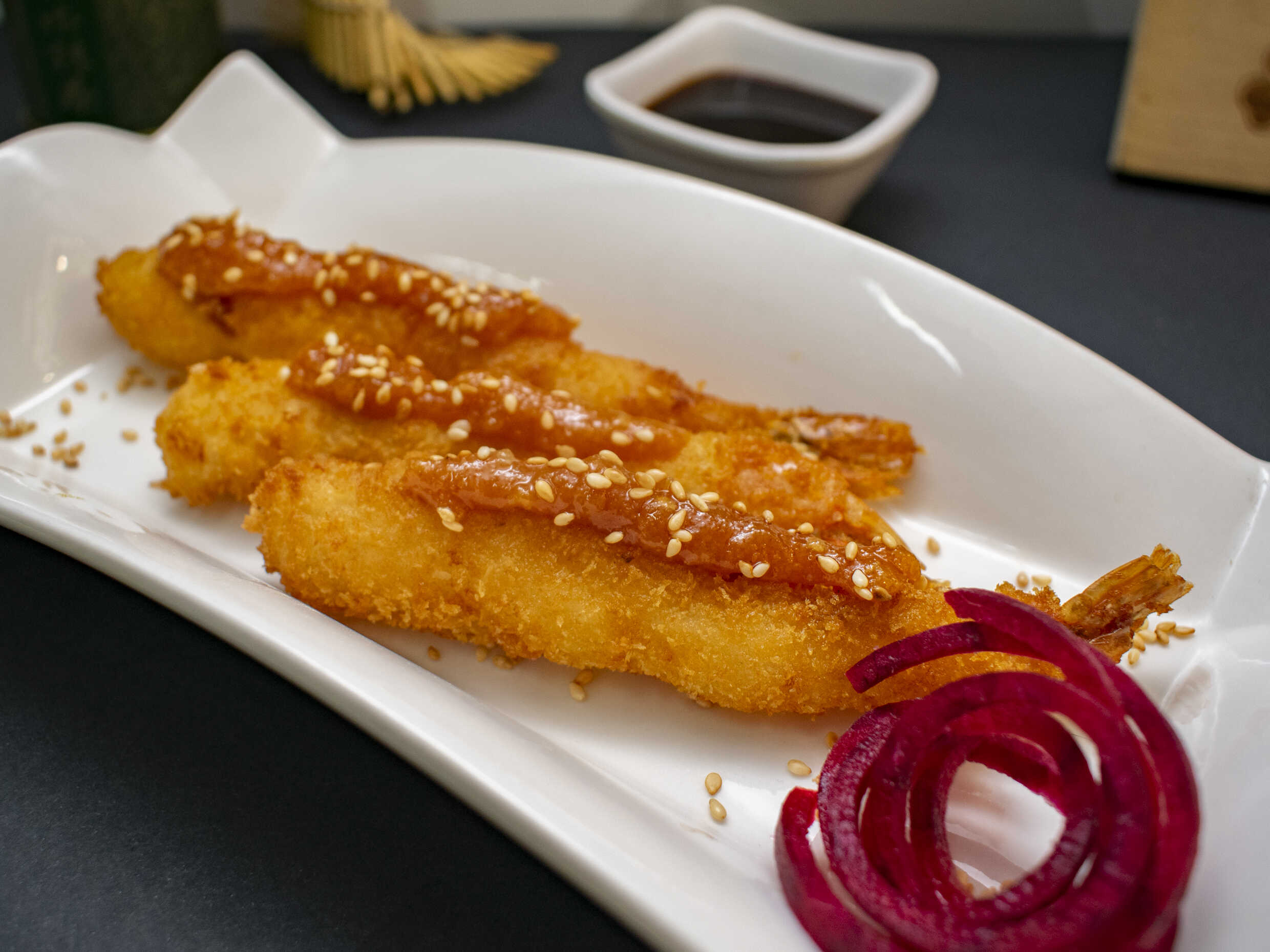 Rollo apanado relleno de langostino crocante, queso crema y aguacate.