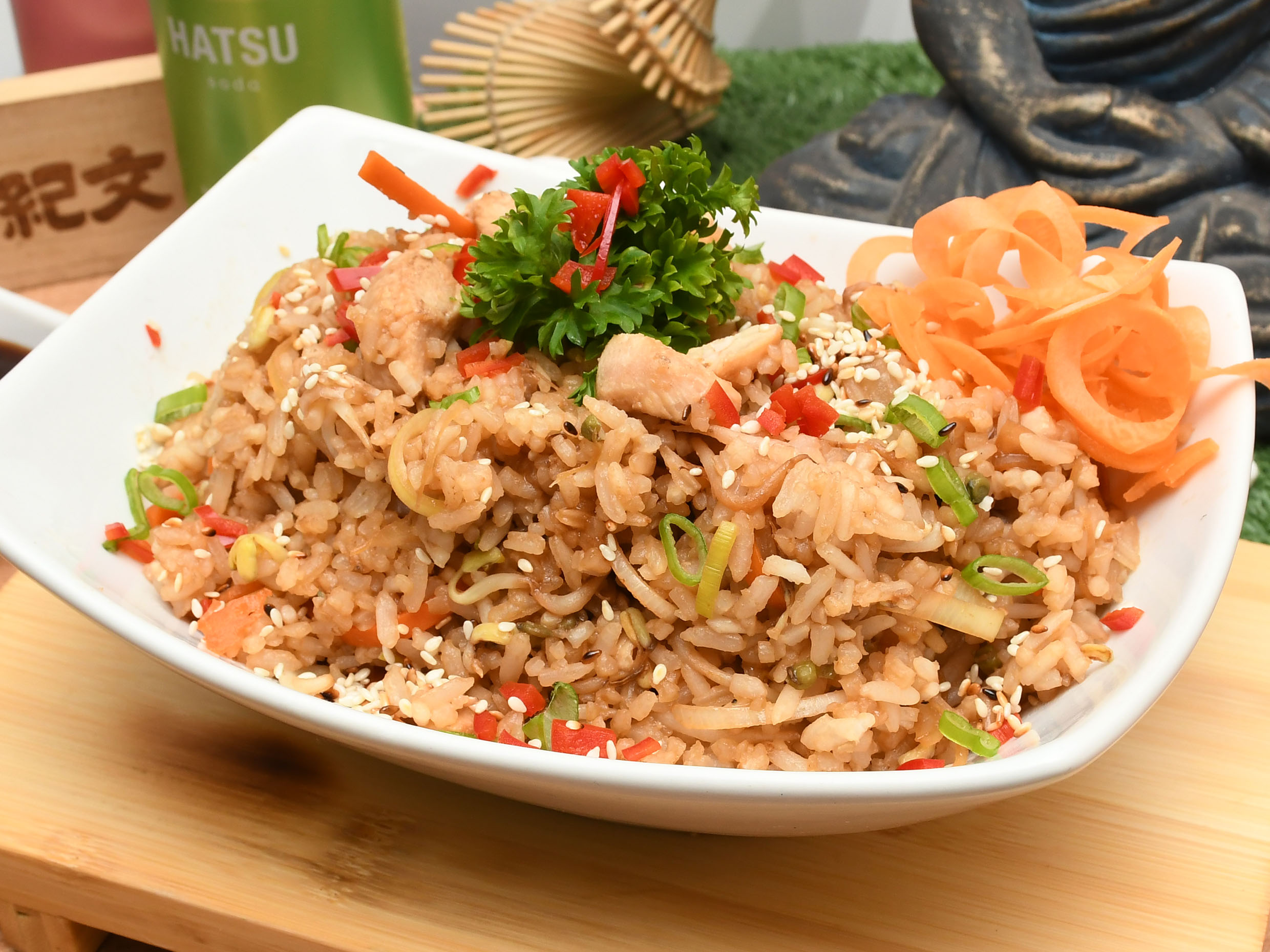 Muslos de pollo marinado crocantes, acompañados de arroz salteado, ensalada del día y sopa miso.