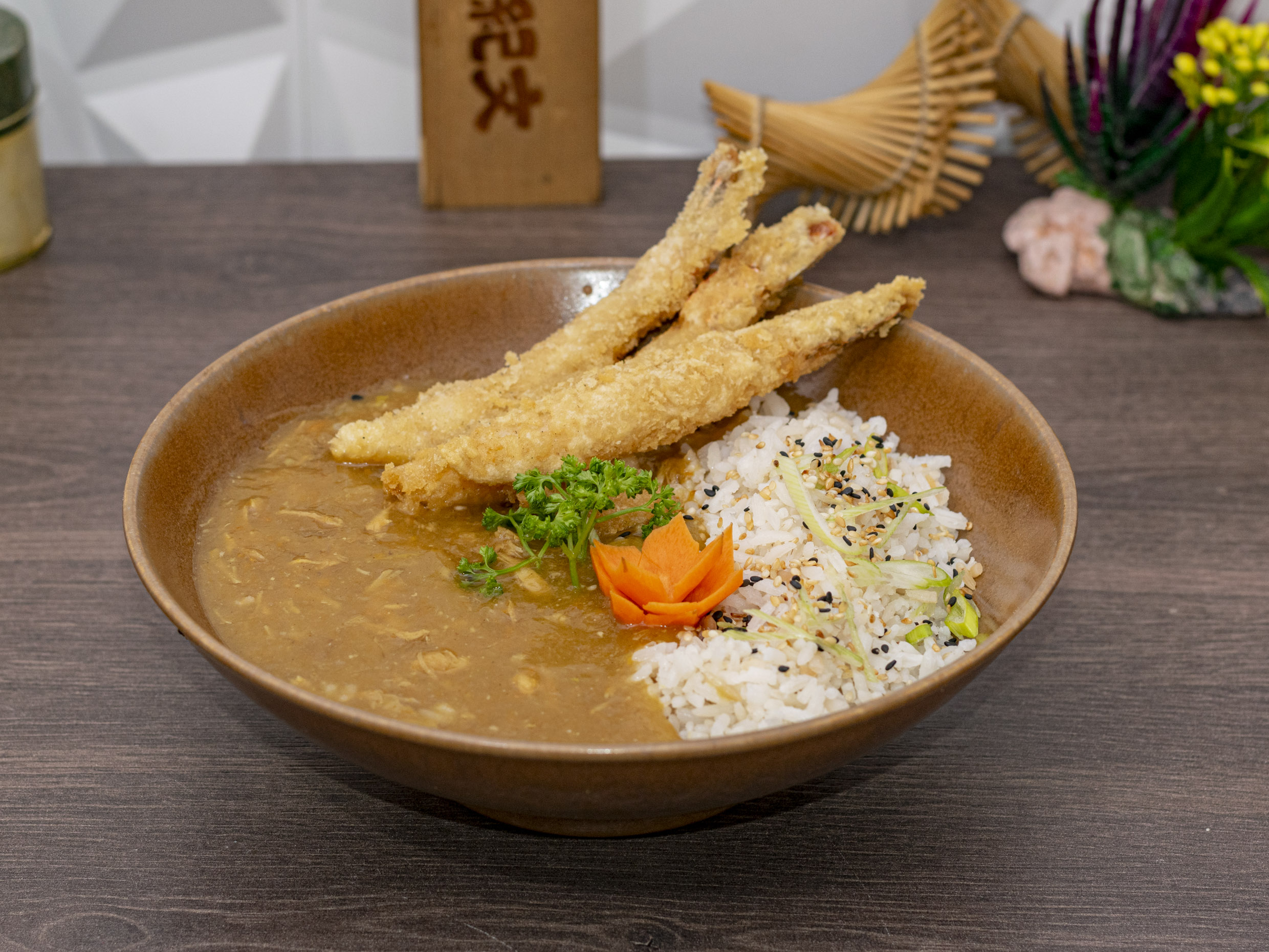 Curry con pierna de pollo marinada crocante y topping a elección.