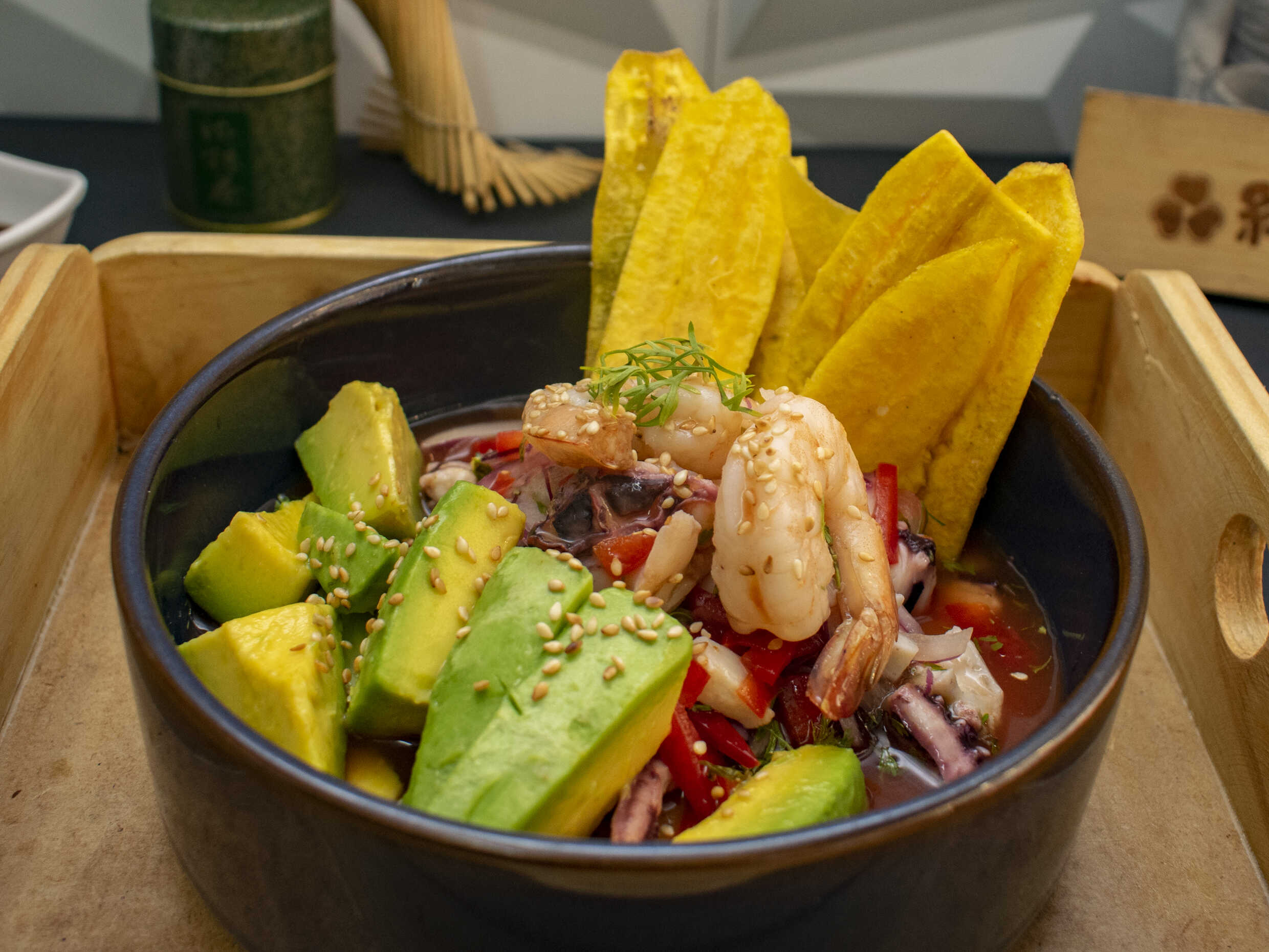 Ceviche de calamar, pulpo y camarón marinado en leche de tigre con cebolla morada, ají dulce, cilantro y su toque picante, acompañado de aguacate y chips de plátano.