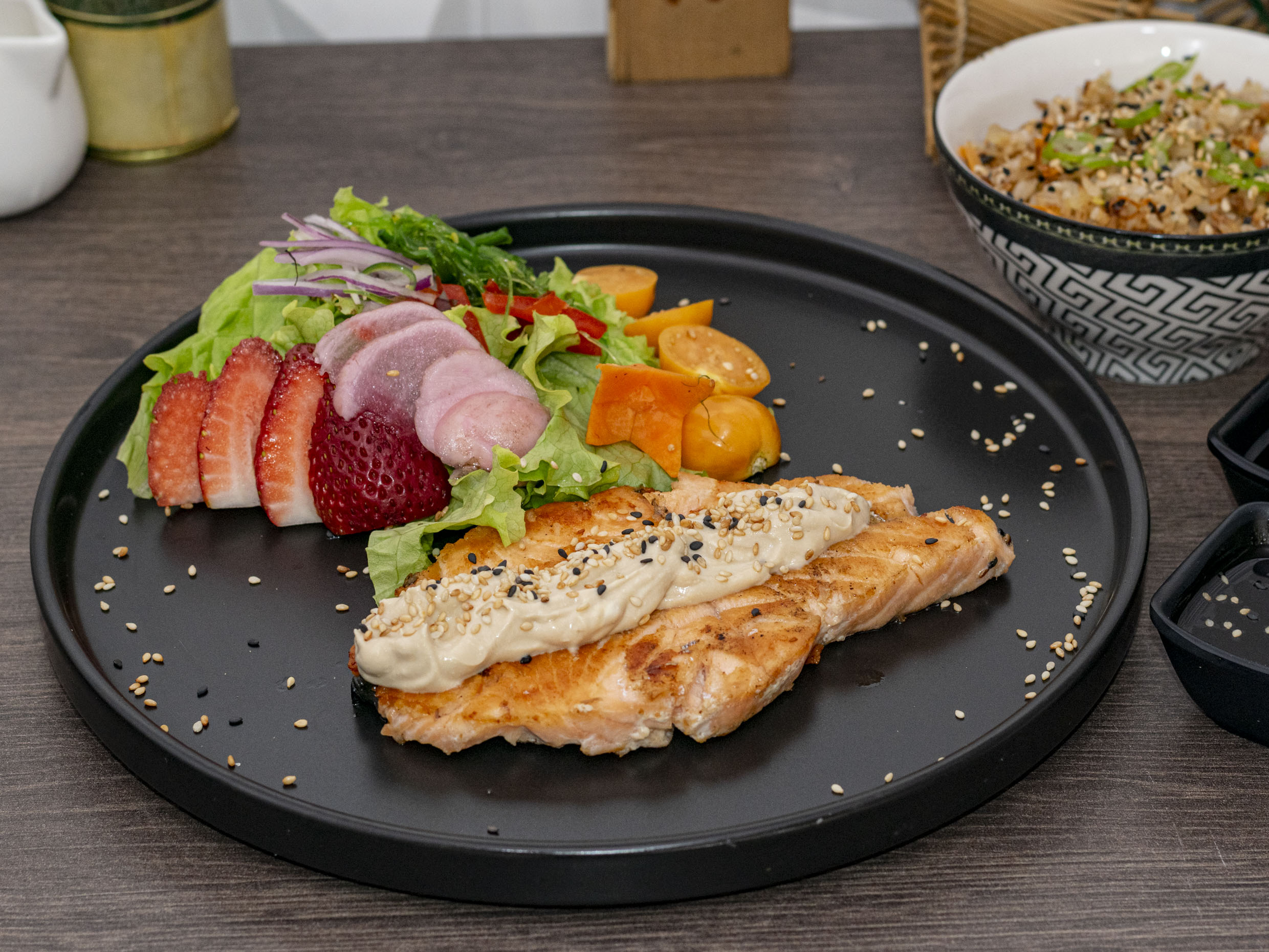 Salmón a la plancha en crema de champiñones, acompañado de arroz salteado, ensalada del día y sopa miso.