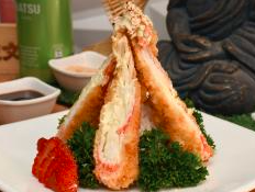Rollo apanado relleno de pez blanco, mango y queso crema cubierto de ensalada de hilos de batata crocante y cangrejo.