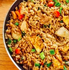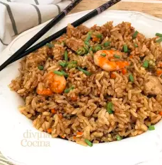 Arroz salteado con pollo, carne.