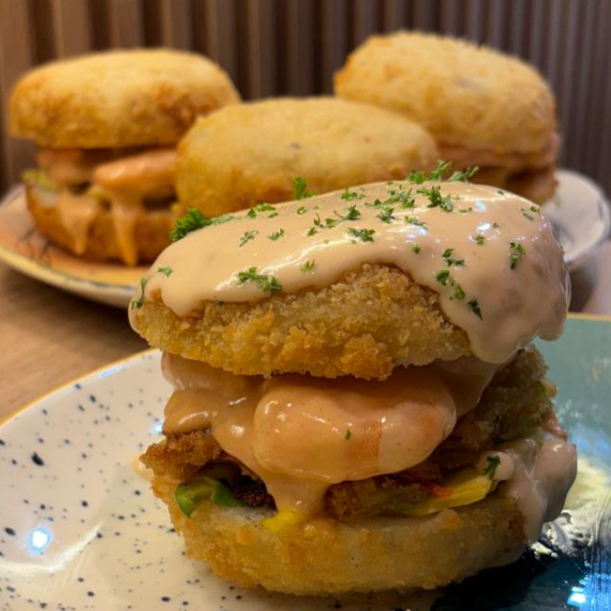 Hamburguesa de arroz apanado, relleno de palmito de cangrejo con salsa de ostras, aguacate, anillos de calamar, cebolla crocante y queso crema.