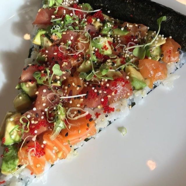 2 triangulos de pizza con dinamita, salmón, aguacate, mango, masago, salsa teriyaki en una crocante cama de alga nori y arroz.