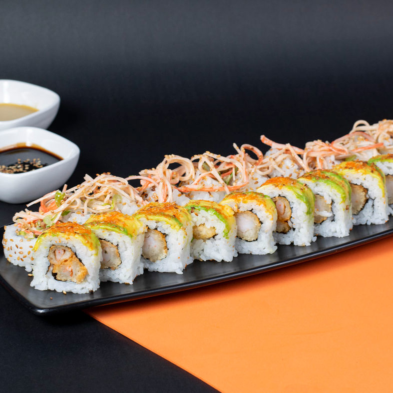 20 bocados de sushi: 10 bocados rellenos de camarones apanados, queso crema, toping de aguacate y salsa de maracuya y 10 bocados rellenos de tilapia apanada, queso crema y toping de palmito kanikama desmechado en salsa dinamita (picante ligero)