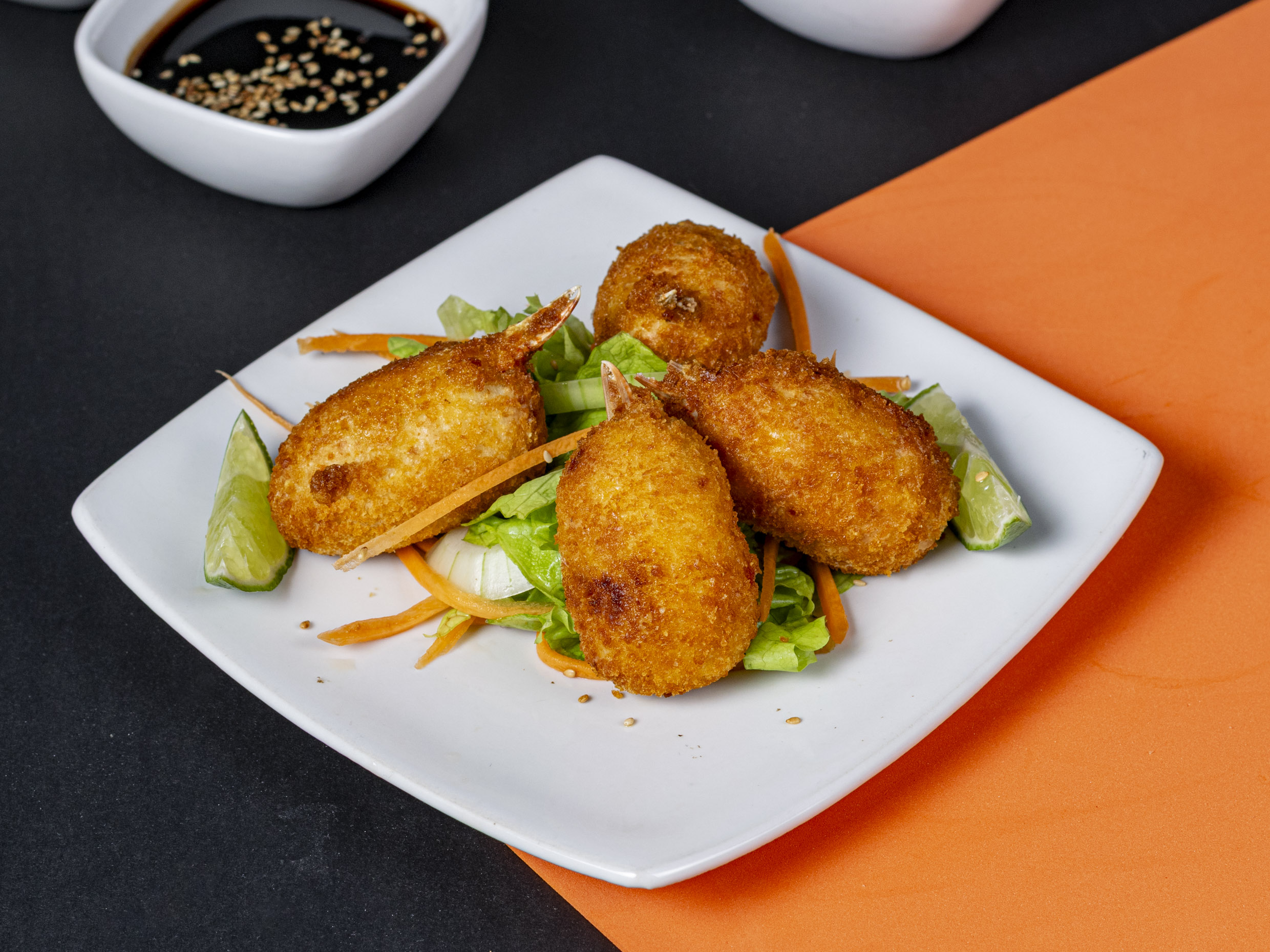Deliciosas croquetas de cangrejo en salsa dinamita.