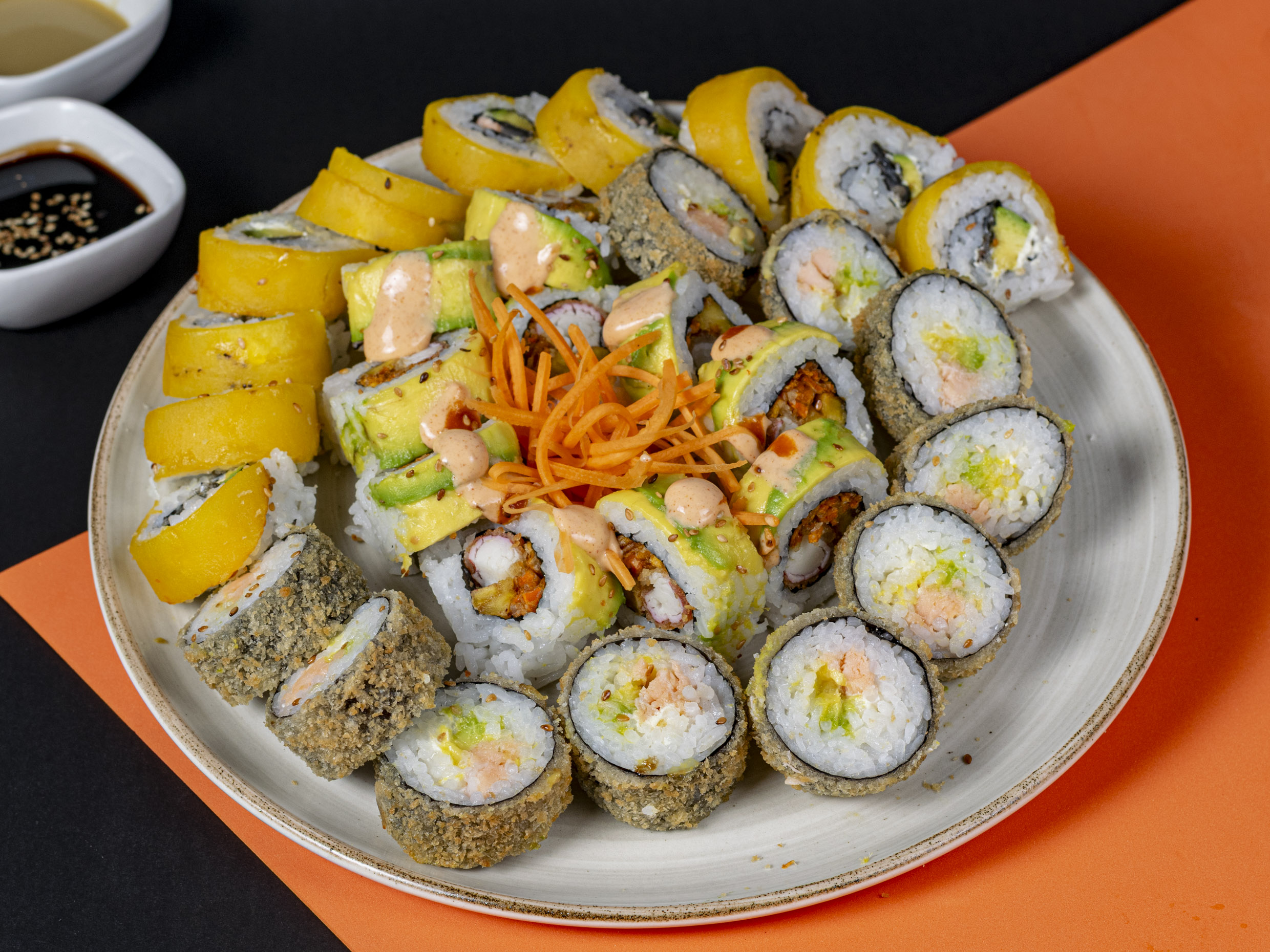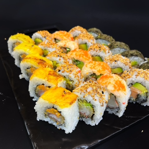 20 piezas en total: 10 piezas rellenas de palmito kanikama en salsa dinamita (picante) con toping de aguacate y salsa de anguila. y 10 piezas rellanas de salmon tempura, aguacate,queso crema con toping de coco.