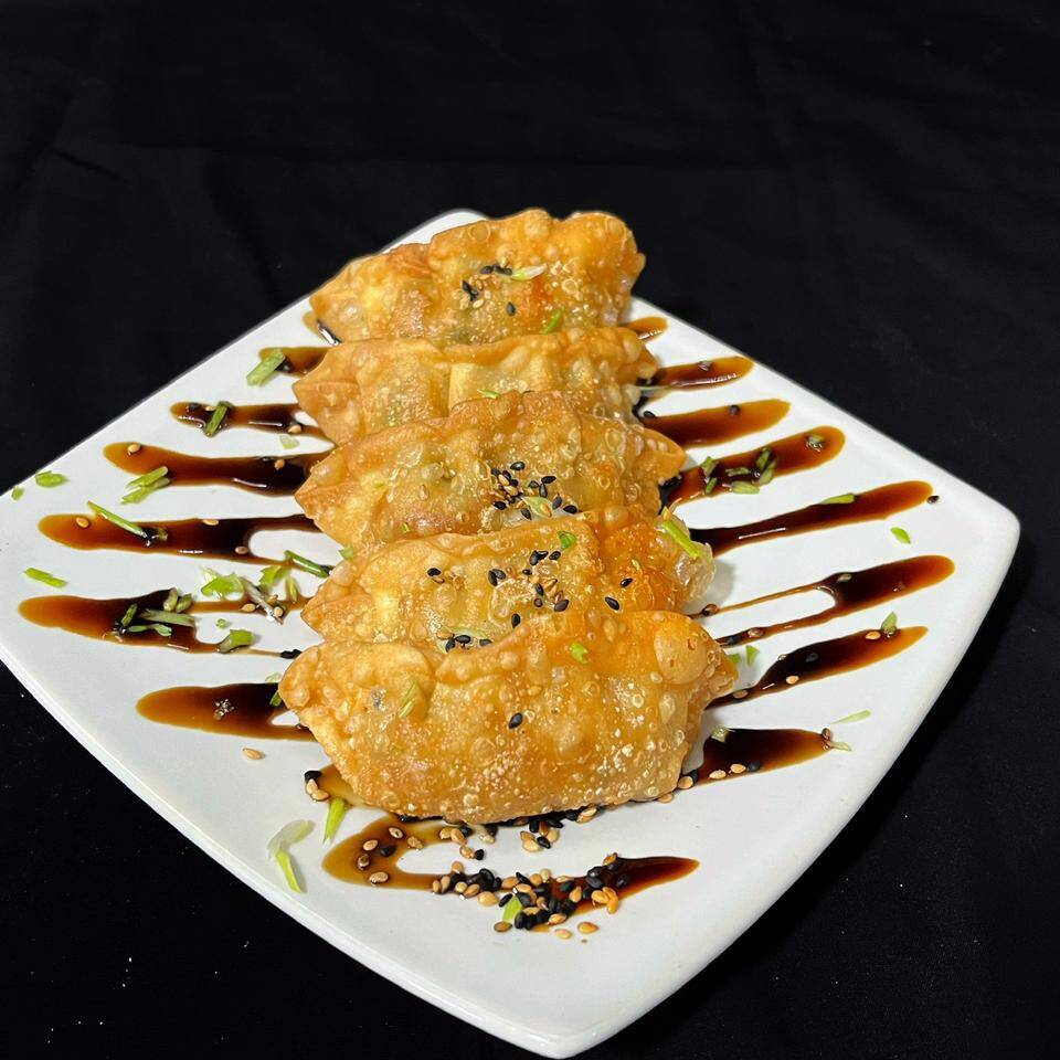 Deliciosas Gyozas de camarones x5 unidades acompañadas de salsa chile dulce.