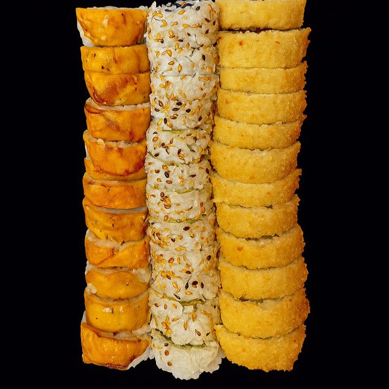 36 bocados de sushi: 12 relleno de palmito de cangrejo apanado, queso crema, aguacate (toping platano) 12 bocados rellenos de palmito tempura, queso crema y ajonjoli, y 12 bocados rellenos de tilapia apanada, queso crema, aguacate, (rollo apanado)