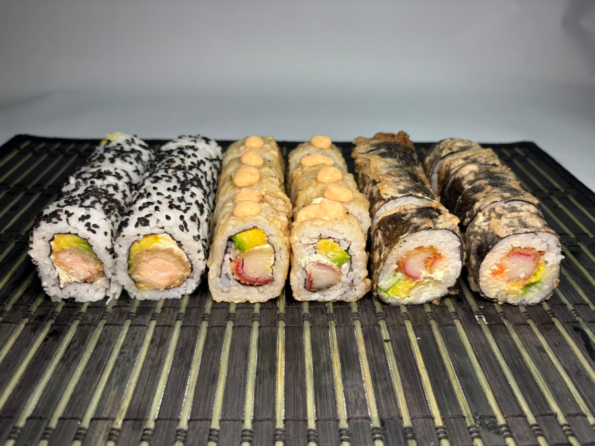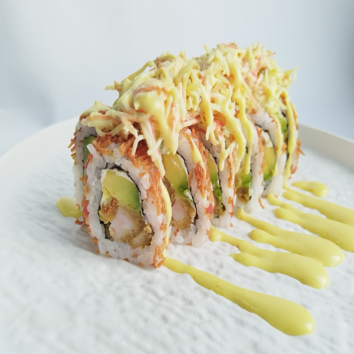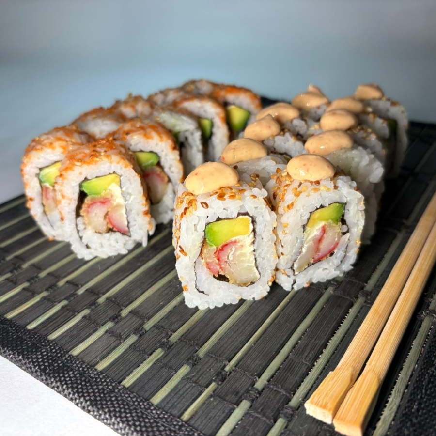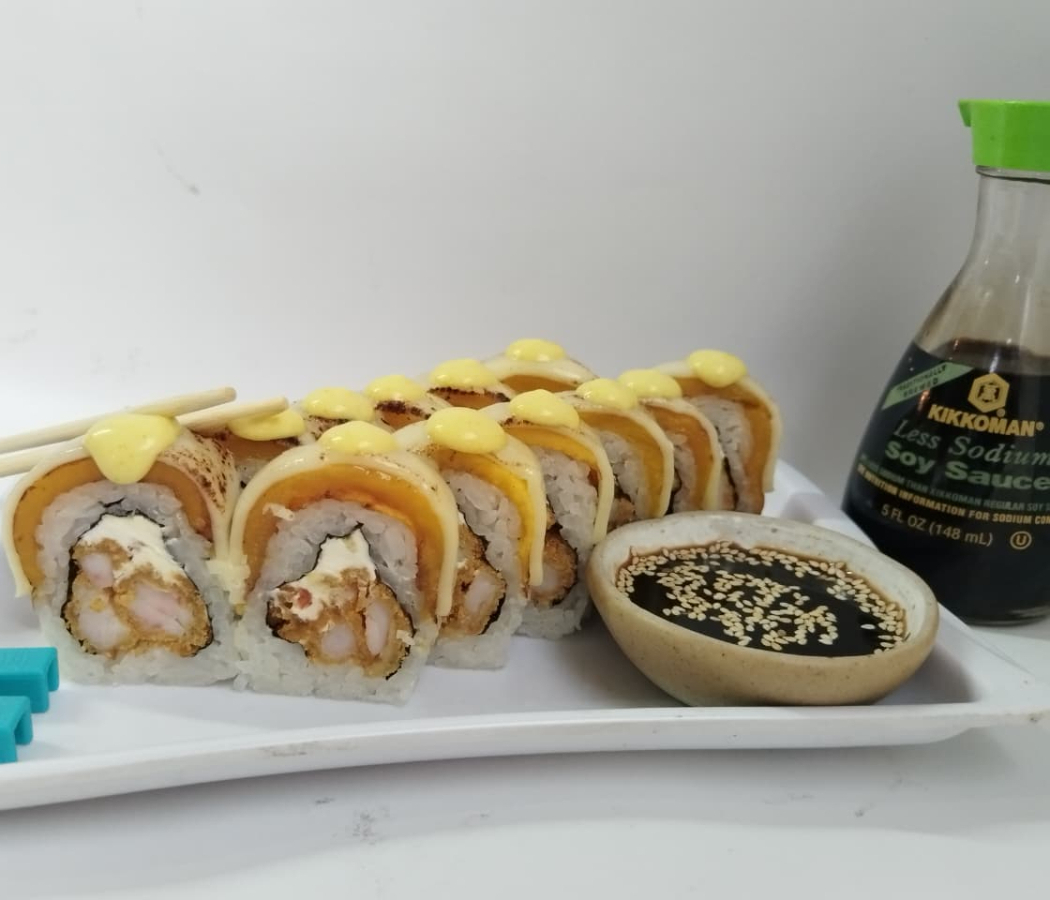 Makis especiales 10 bocados relleno de queso Philadelphia y camarones tempura. Topping de aguacate y salsa honey mustard.
