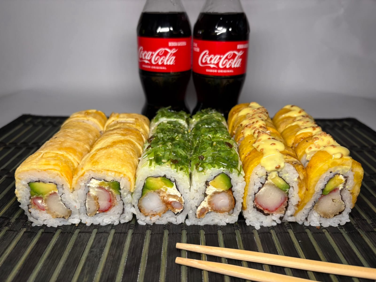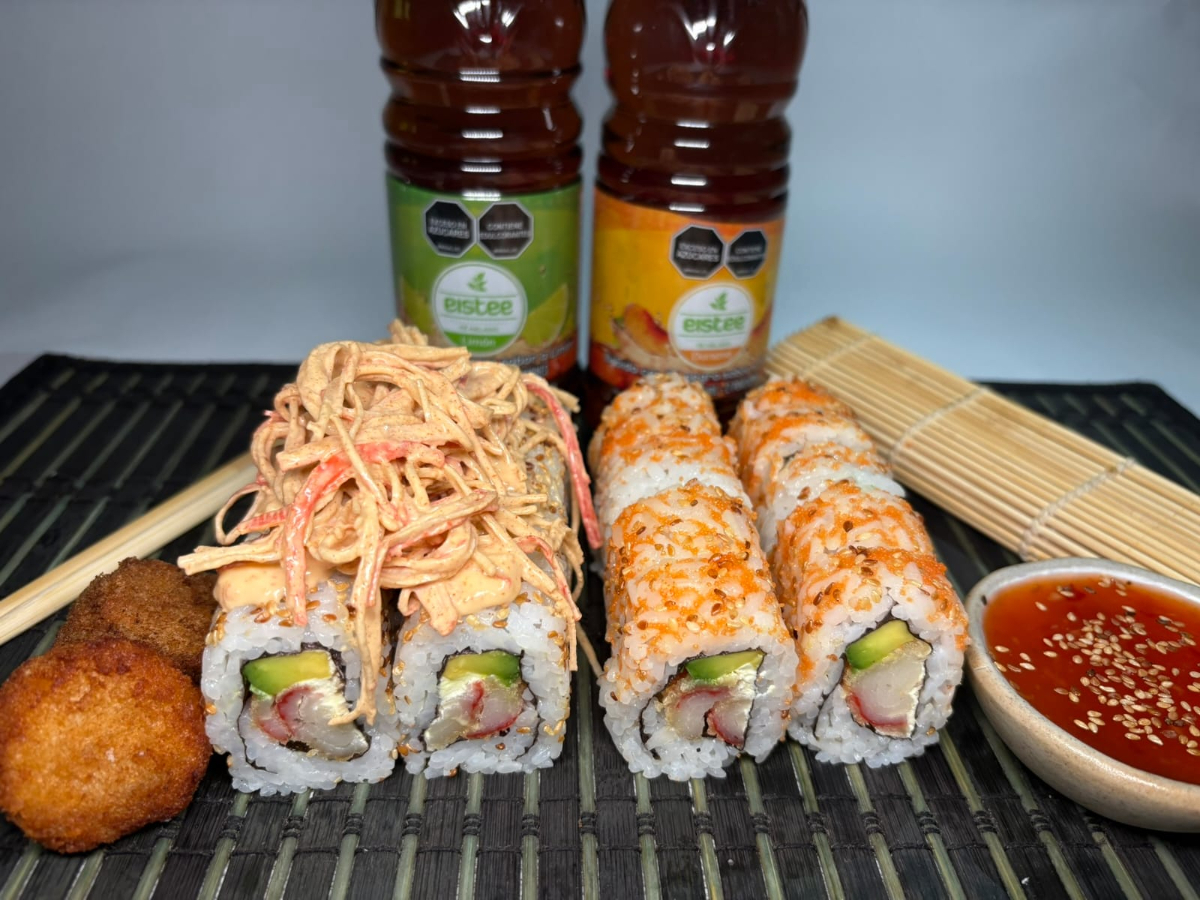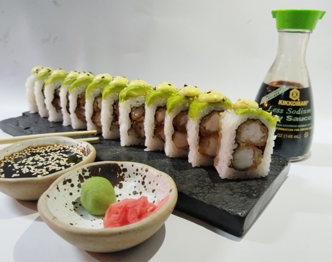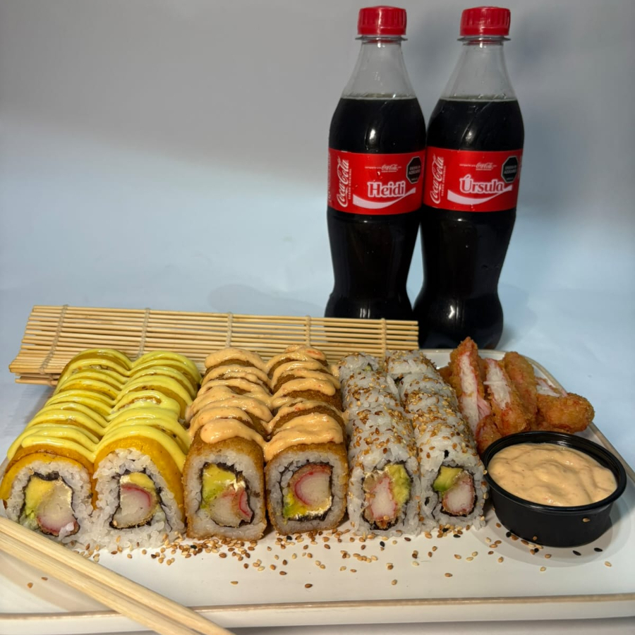 10 piezas de camarón salad Green, 10 piezas de tropical roll y 10 piezas de tamago roll. Acompañado de 2 bebidas personales