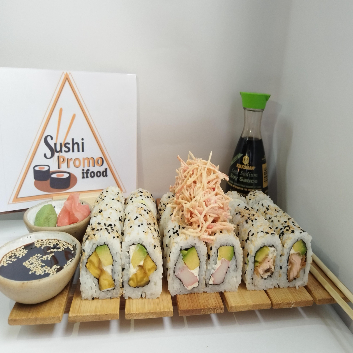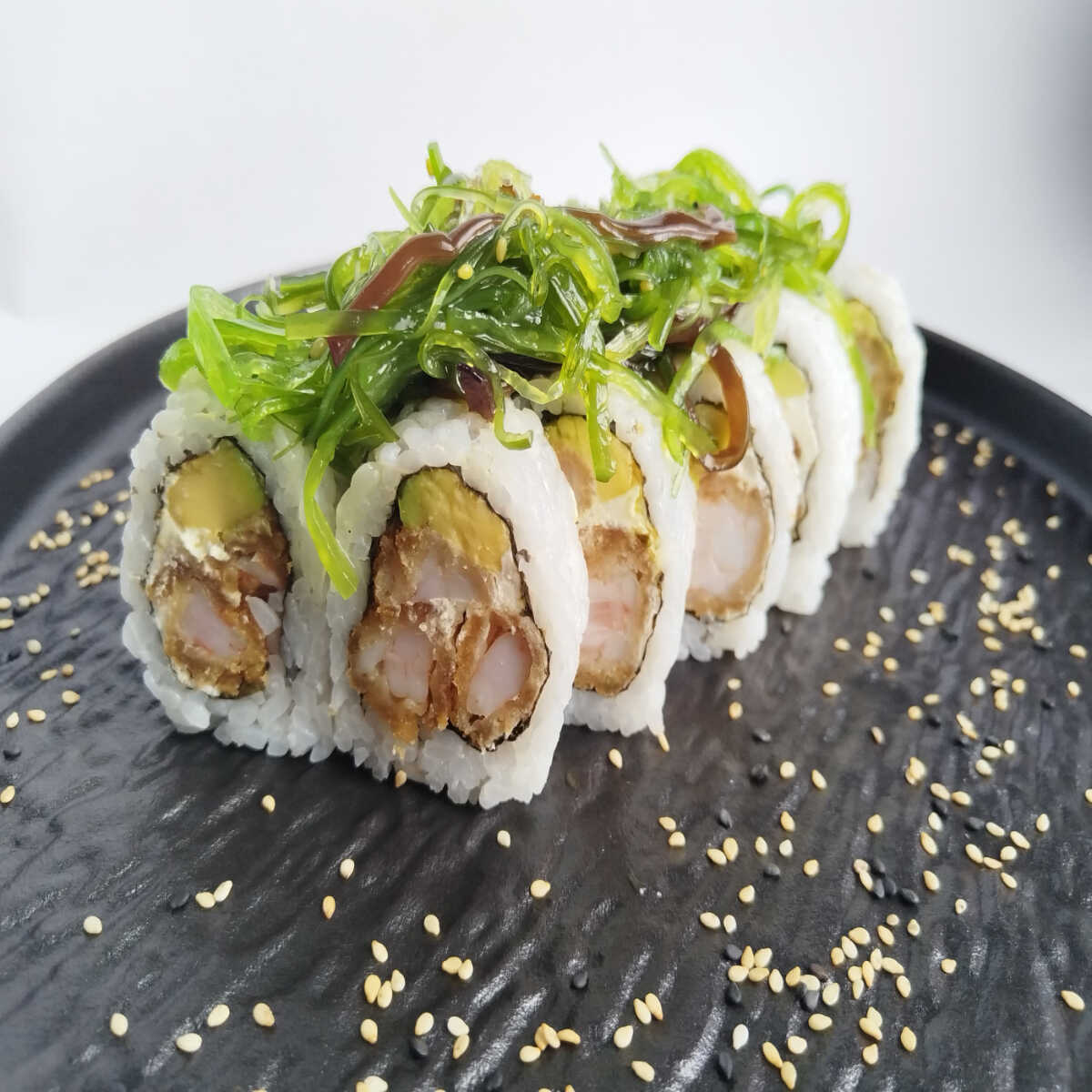 Makis tradicionales 10 bocados salmón, atún, kanikama, masago y aguacate. Cubierto de sésamo negro.