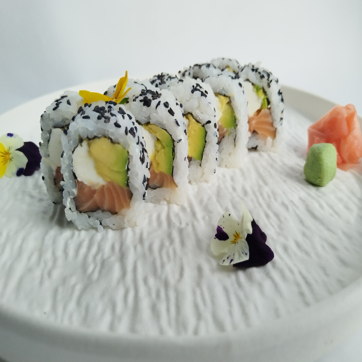 Makis tradicionales 10 bocados relleno de queso Philadelphia, aguacate y salmón fresco con topping de ajonjolí negro.