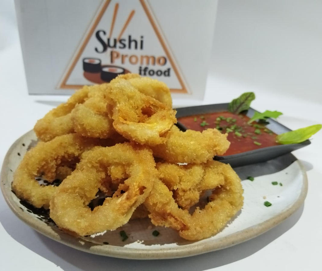 8 Unidades de anillos de calamar apanados. Acompañado de agridulce.