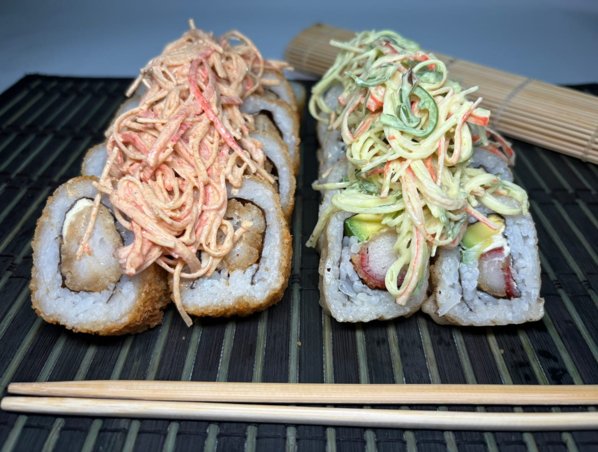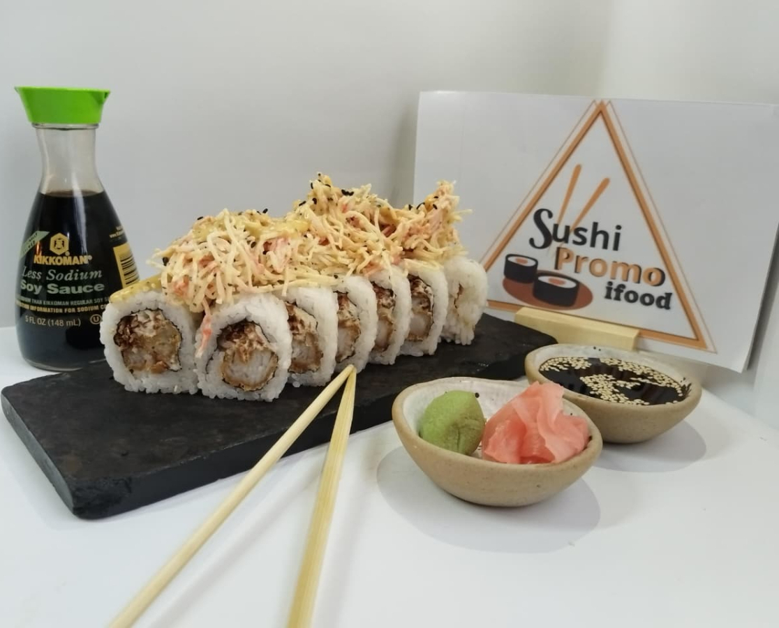 Makis especiales 10 bocados rollo relleno de tilapia apanada, queso Philadelphia y cebolla cronch. Coronado con deliciosa ensalada de kanikama y salsa de maracuyá.