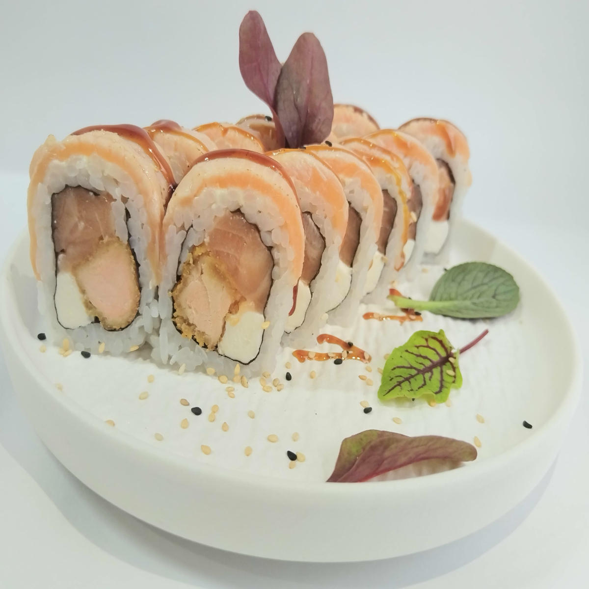Makis especiales 10 bocados relleno de queso Philadelphia, salmón apanado y salmón fresco. Topping de salmón flameado.