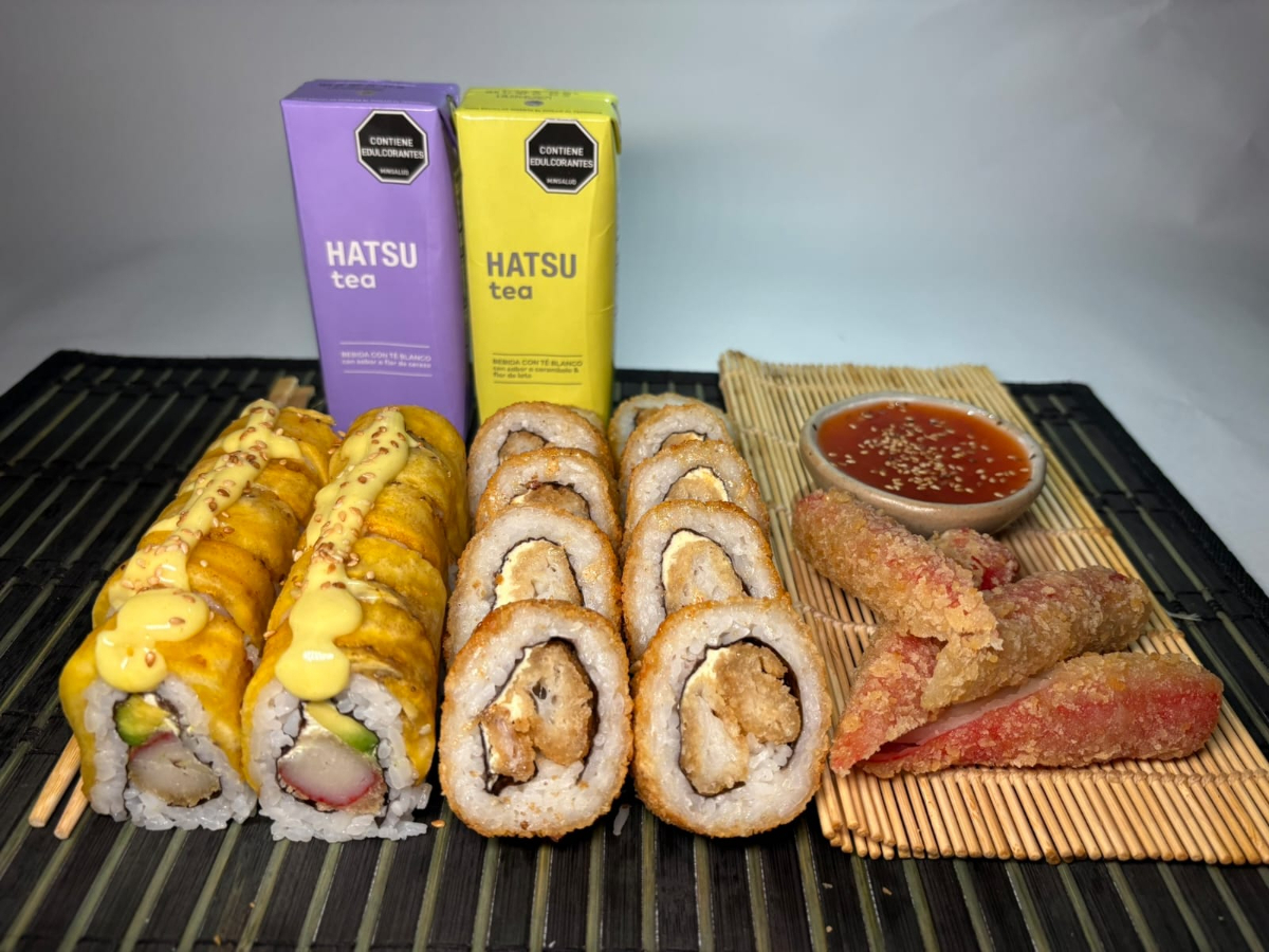 10 piezas de tempura roll y 10 piezas de tropical roll. Acompañado de kani cronch y 2 bebidas personales