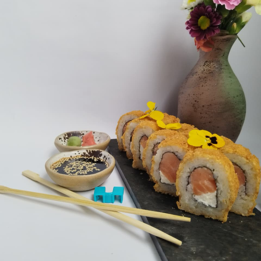Makis especiales 10 bocados relleno de salmón y queso Philadelphia. Rollo totalmente apanado
