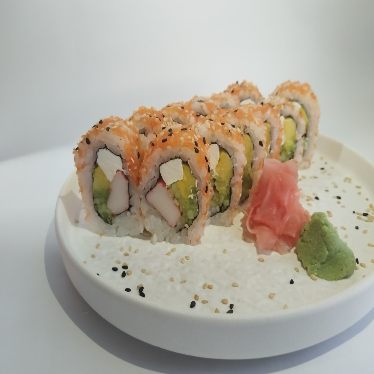 Makis tradicionales 10 bocados relleno de queso Philadelphia, aguacate, pepino y kanikama con topping de masago.
