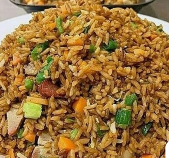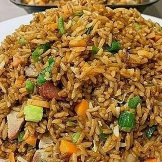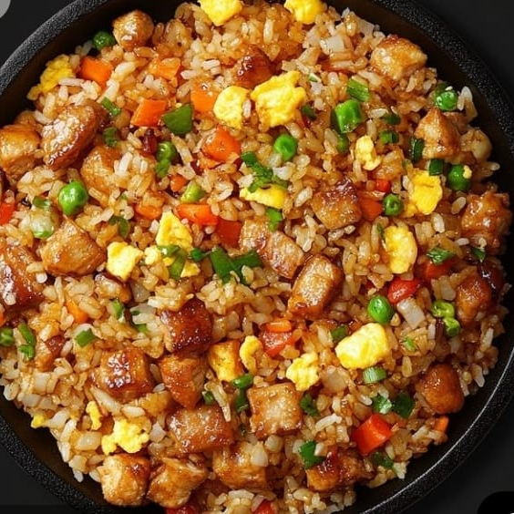 Arroz salteado con Cerdo, carne de res y vegetales frescos.