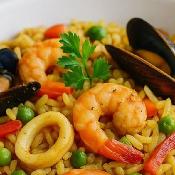 Exótico arroz con Camarón, calamar, cangrejo y mejillón. Preparado con vegetales salteados.