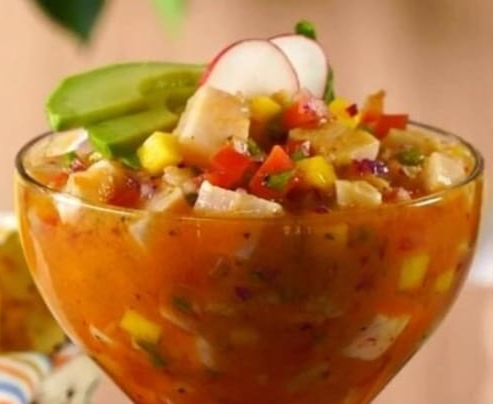 Pescado blanco marinado con sal, pimienta, ajo, limón, Ajinomoto, cebolla morada en juliana, mango en cubos y salsa de cóctel. Acompañado con chip de plátano.