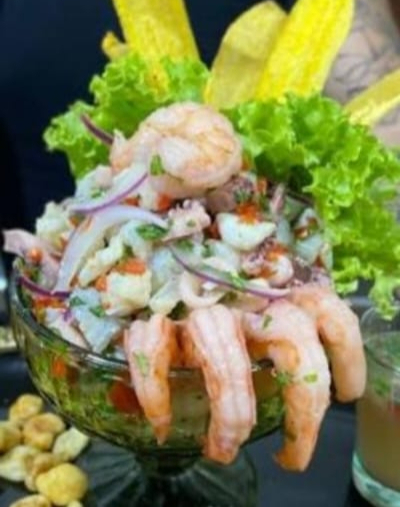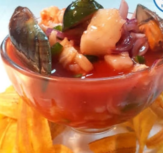 Deliciosa combinación de Camarón, pescado blanco y mejillón. Marinado con sal, pimienta, ajo, limón, Ajinomoto, cebolla morada en juliana, mango en cubos y salsa de cóctel. Acompañado con chip de plátano.